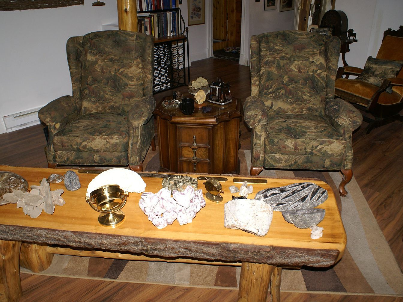 Two plush, wingback armchairs with forest green camouflage-patterned upholstery face a thick, rustic wooden coffee table. The coffee table, crafted from a solid tree slab with bark edges, is topped with various collectibles, including rocks, fossils, a brass instrument, and shells. Behind the chairs, an ornate wooden side table holds small decorative items, while a rocking chair upholstered in a rich brown fabric sits to the right. A large, multicolored area rug defines the seating area atop polished wooden floors. The backdrop features white walls adorned with bookshelves, framed art, and warm wood accents creating a cozy, vintage atmosphere.