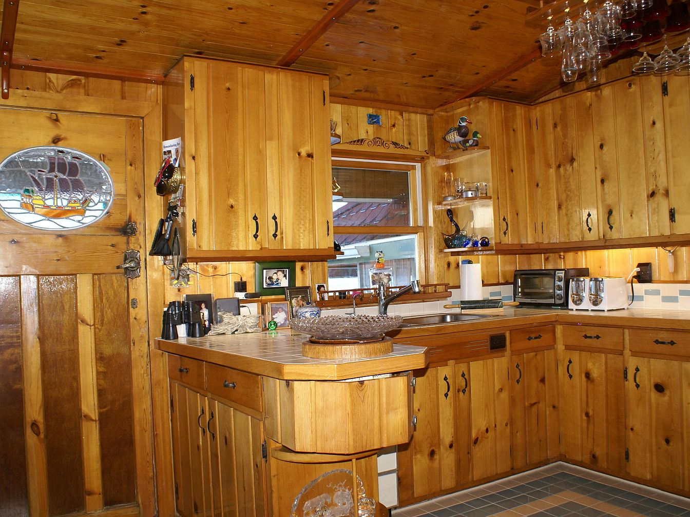 A cozy kitchen is adorned with warm, honey-toned knotty pine cabinetry that wraps around two walls and extends to both the ceiling and the entrance door, creating a unified woodsy aesthetic. The door features an oval window with a stained glass sailing ship for added character. The countertops are tiled in earthy hues, providing a textured contrast to the wood. Above the sink, a single window offers a glimpse outside and allows natural light in. Vintage kitchen appliances, neatly organized jars, and miniature decorative ducks add personal charm, while a rack of shimmering glassware hangs overhead. The flooring is checkered in blue and tan, completing the homey, rustic atmosphere.