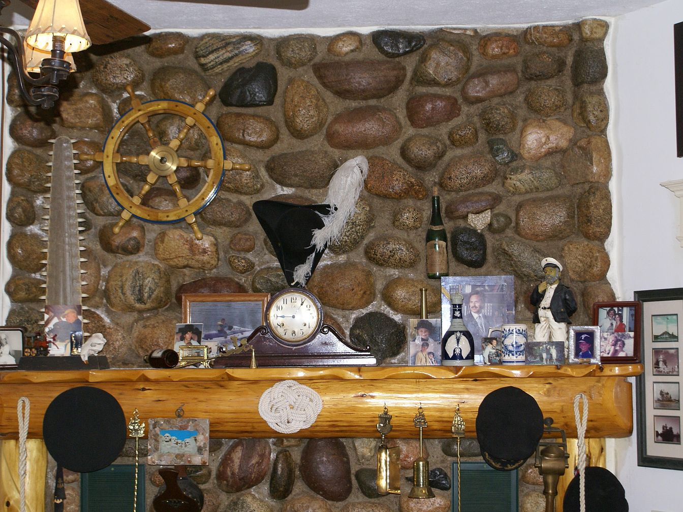 A rustic stone fireplace wall serves as the focal point, featuring a wooden mantel adorned with maritime and nautical memorabilia. A wooden ship’s wheel and an old saw blade are mounted against the stones, while the mantel displays a vintage clock, framed family photos, and sailor figurines. Decorative ropes, brass bells, hats, and a bottle further the maritime theme, creating a sense of nostalgia and history. Warm, earth-toned stones and wood complement each other, and the gentle light from a nearby sconce adds a cozy, inviting atmosphere. The overall style blends personal heritage touches with traditional American coastal charm.