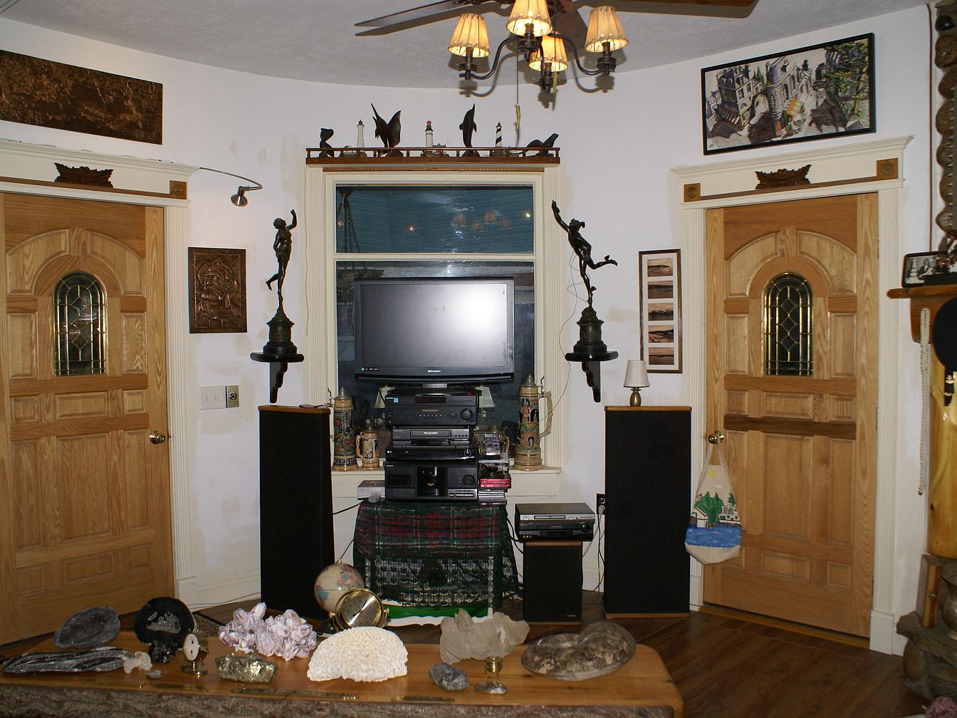 A cozy living room with a symmetrical layout featuring two ornate wooden doors with decorative glass panels on either side of a double-hung window. The room is painted in off-white and crowned with dark oak trim. Under the window sits a television and a stack of electronic components, flanked by two tall black speakers. Above the window, a shelf displays a line of bird sculptures, while the walls are decorated with bronze plaques, framed artwork, and sculptures of human figures. The coffee table in the foreground showcases an eclectic collection of stones, minerals, globes, and decorative objects, contributing to an antiquarian aesthetic.