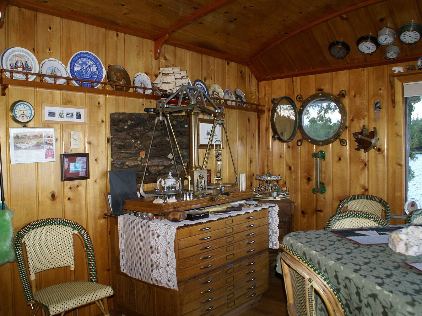 Warm pine paneling covers all walls and the arched ceiling, creating a cozy, cabin-like feel. The area features a vintage wooden flat-file cabinet adorned with a lace runner, nautical instruments, a tea set, and model ships. Wicker and rattan chairs with green and cream checkered seats surround a table with a dark green patterned tablecloth. Above, decorative plates, framed photos, and maritime memorabilia such as a barometer, clocks, and porthole mirrors enrich the space. The overall effect blends rustic charm with a strong nautical theme and vintage elegance, highlighted by the soft golden glow of the wood.
