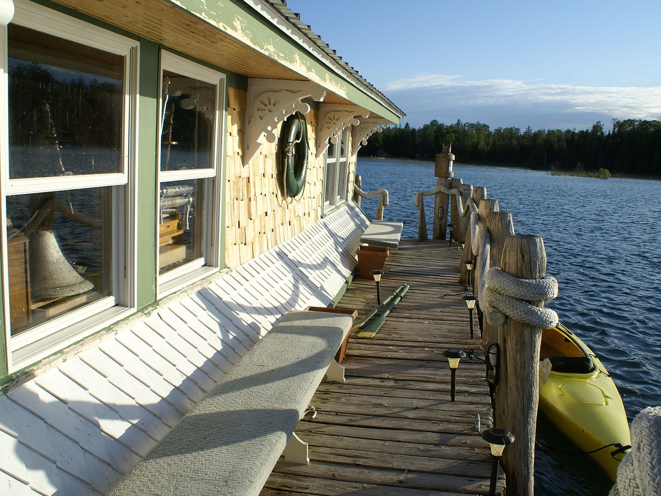 A narrow wooden porch stretches along the side of a house, bordered by rustic log railings wrapped in thick rope. Soft, white benches are built into the house wall, offering a place to sit and admire the lake view. The siding features staggered tan wooden shingles and pale green trim, adding a quaint, weathered charm. Decorative Victorian-style brackets adorn the eaves, while a green life ring is mounted between the wide windows. A yellow kayak is tethered at the edge, reinforcing the waterside setting. Sunlight bathes the porch, highlighting the calm lakescape and distant tree line.