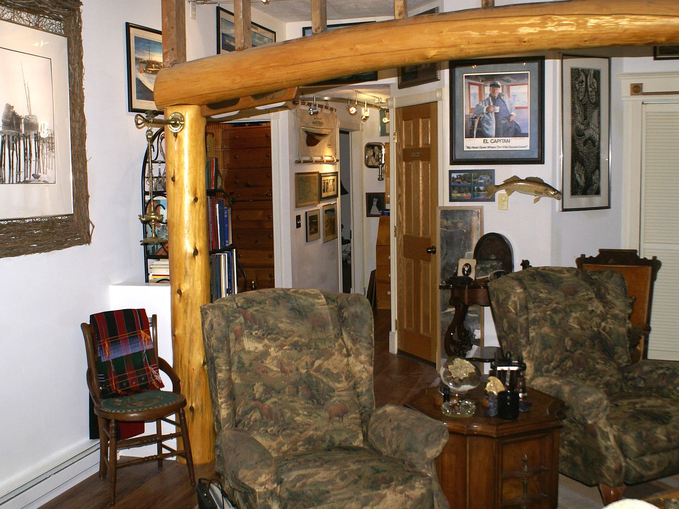 A cozy living area features rustic log beams overhead and wood-paneled architectural details, lending the space a cabin-like charm. Two armchairs upholstered in camouflage-patterned fabric sit around a wooden side table adorned with decorative items. A wooden chair draped with a colorful blanket rests against a white wall, which displays an eclectic collection of framed art, including landscapes and portraits. The light walls contrast with warm wood accents, including doors and trim. Bookshelves and small furniture pieces are visible throughout, creating a sense of comfort and personalized decor. The layout leads into a hallway filled with more artwork, giving the home an inviting, lived-in feel.