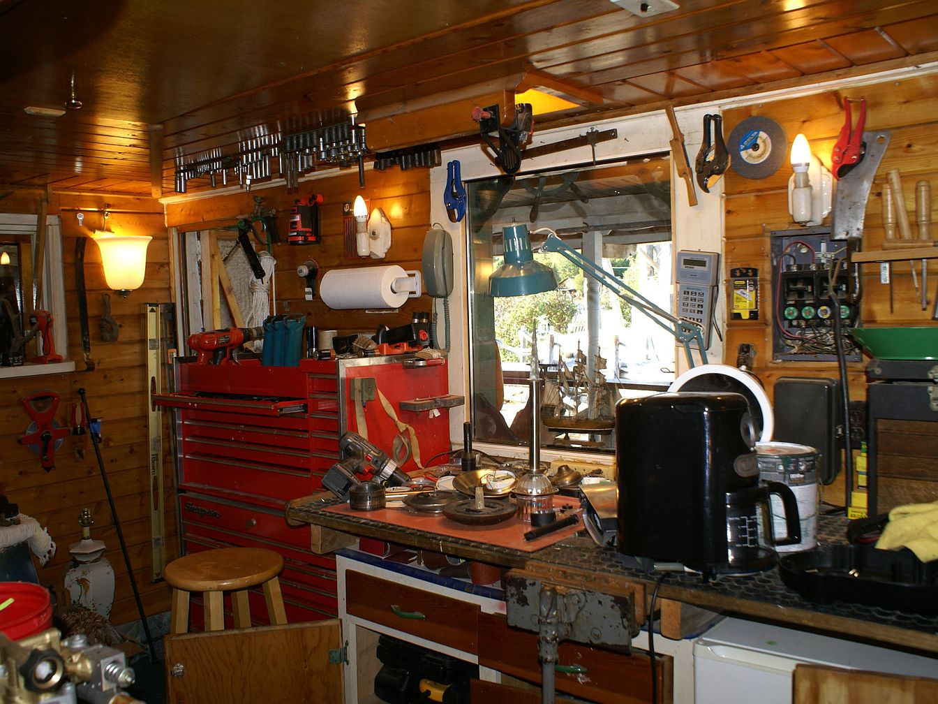 This room is a well-used workshop featuring wooden walls and ceiling finished in a glossy varnish, which gives the space a warm, rustic ambiance. A large red tool chest stands against one wall, surrounded by a variety of power tools, hand tools, and hardware meticulously organized on racks and hooks. The workbench is cluttered with mechanical parts and equipment, including a black coffeemaker and a green adjustable lamp. Natural light comes through a wide window above the workbench, offering a view outside. The area is practical, with ample storage, functional task lighting, and a blend of industrial and homey touches.