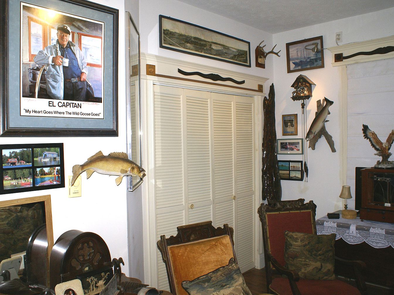 A cozy corner of the living room is decorated with Americana and outdoors-themed memorabilia. The walls are white, adorned with framed photographs, paintings, and a large portrait titled ‘El Capitan.’ Two mounted fish and a pair of antlers add a rustic feel. Below the artwork, vintage wooden armchairs with textured, richly colored cushions face inward. The closet with louvered doors sits in the corner, topped with a decorative carved piece. An old-fashioned radio sits on a lace-covered table alongside a small lamp. Natural woods, hunting trophies, and lake-themed photos combine to evoke nostalgia and the spirit of adventure.