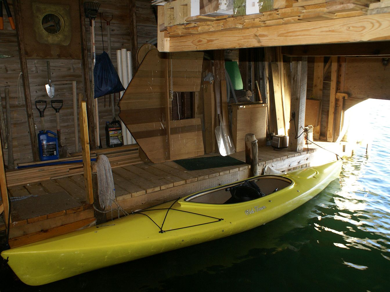 An indoor area featuring a wooden dock extending into a body of water, giving access to a yellow kayak floating beside the deck. The space is constructed with wooden walls and beams, showcasing exposed wooden planks and a rustic, utilitarian design. Garden tools, oars, and maintenance supplies are organized on one side, suggesting functionality and readiness for outdoor activities. Natural light enters through a large opening to the right, casting reflections on the water and illuminating the wooden textures. The overall atmosphere is practical and inviting, blending storage and water access with a casual, lakeside charm.