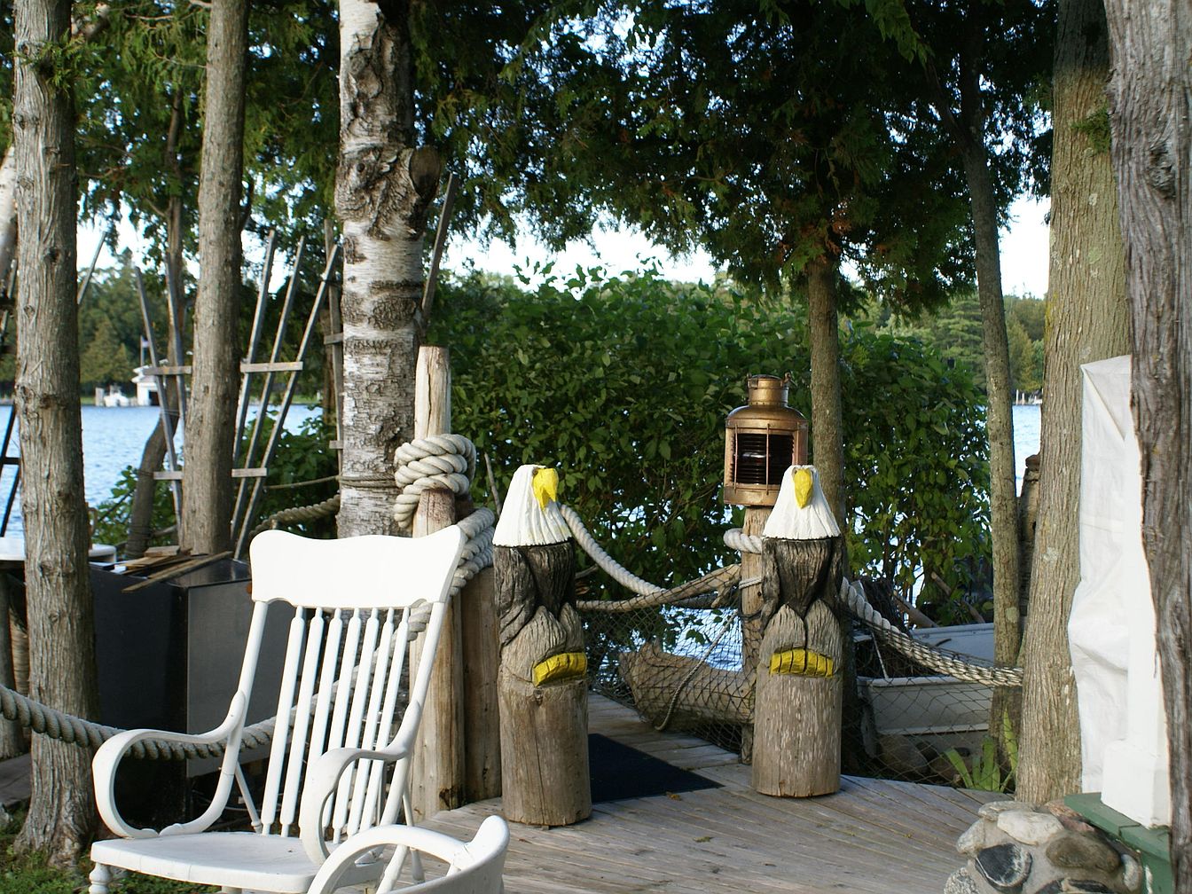 Nestled under a canopy of mature trees by the water’s edge, this wooden deck features a worn white rocking chair positioned for a peaceful view of the lake beyond. Nautical touches abound with thick, coiled ropes looping between carved wooden posts topped with large eagle heads, their beaks painted yellow for accent. An antique bronze lantern sits atop one railing post, adding historic character. The dock’s atmosphere is rustic and inviting, with natural wood planks and surrounding greenery blending smoothly into the lakeside environment, creating a tranquil, nature-inspired retreat ideal for relaxation and reflection.