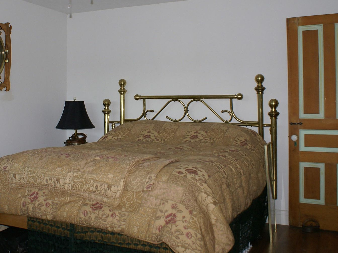 A classic brass bed frame dominates the room, featuring ornate spindles and a shiny, golden finish. The bed is topped with a thick, brocade-patterned quilt in warm beige with subtle hints of rose and green. Next to the bed sits a small wooden nightstand supporting a dark, velvet lampshade. The walls are painted plain white, enhancing the historic simplicity. To the side, a wooden door stands out, accented with panels bordered in a pale mint green. A decorative, oval mirror with a carved wood frame hangs nearby, lending a touch of elegance to the otherwise understated room.