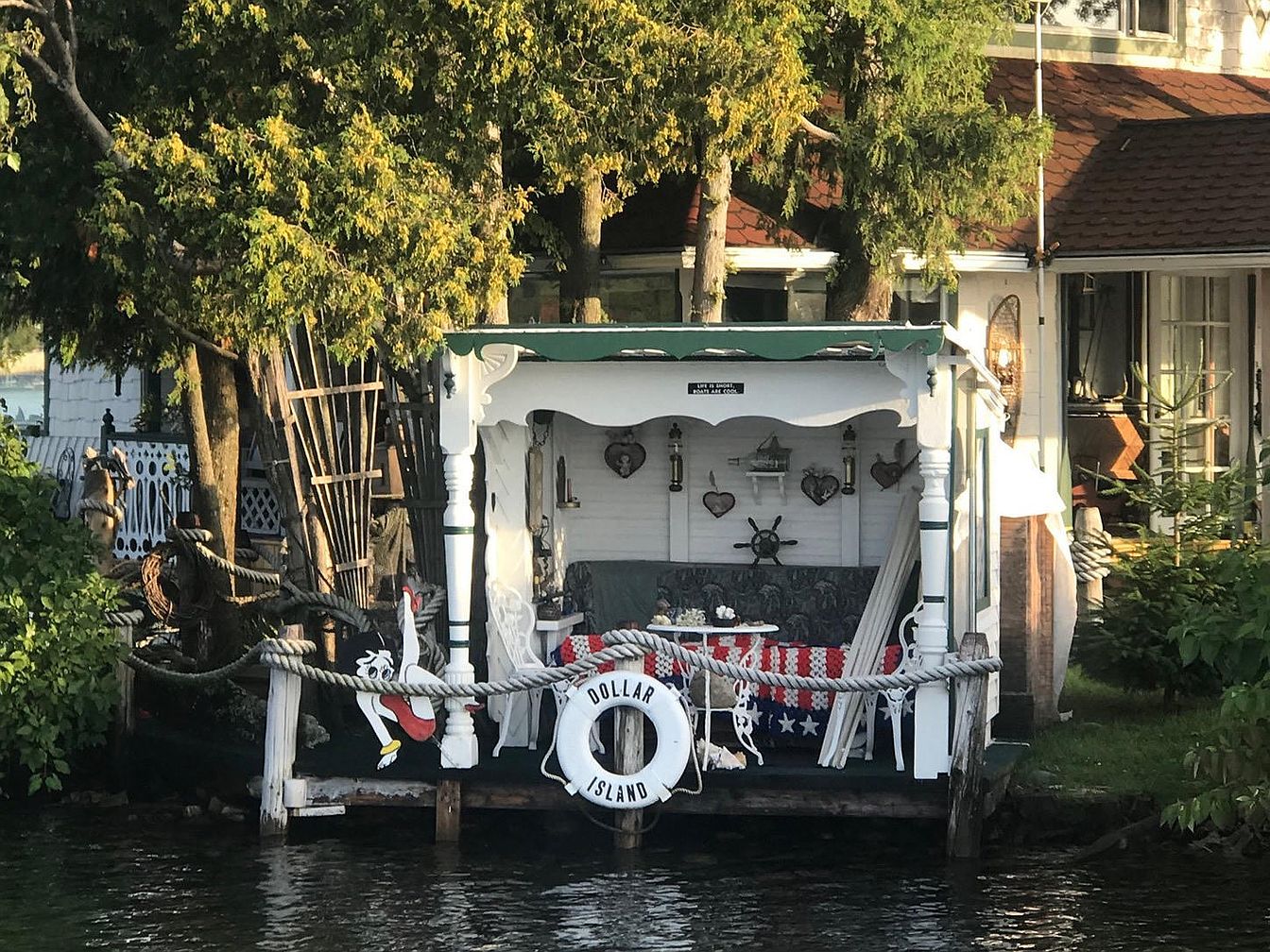 A small, cozy porch sits directly on the waterfront, framed by white trimmed posts and decorative woodwork, shaded by overhanging trees. Nautical touches include a life preserver labeled ‘Dollar Island,’ a boat steering wheel on the rear wall, and marine lanterns. The space features a cushioned bench with a crocheted red, white, and blue afghan, and a white table with a small floral centerpiece. Ropes serve as railings, enhancing the maritime theme, while heart-shaped wall hangings and accents add charm. The porch’s green roof and the surrounding lush foliage create a welcoming, tranquil outdoor retreat ideal for relaxation by the water.