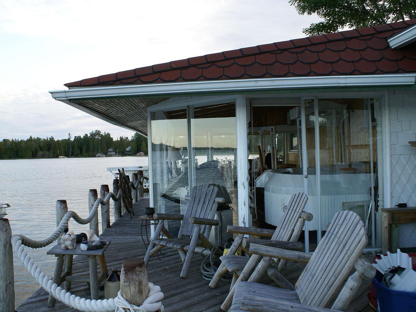 A rustic wooden porch extends over the water’s edge, surrounded by sturdy posts linked with thick white rope for a nautical touch. Weathered Adirondack chairs made of natural wood are grouped for conversation and relaxing while facing the serene lake view. Glass sliding doors connect the porch to the interior, where a glimpse of a cozy sunroom or spa area is visible, featuring wood-paneled walls and a white soaking tub. The porch’s roof sports reddish-brown shingles, complementing the wood tones below. Soft ambient light and lush green treetops across the lake complete the tranquil, warm atmosphere of this inviting lakeside retreat.