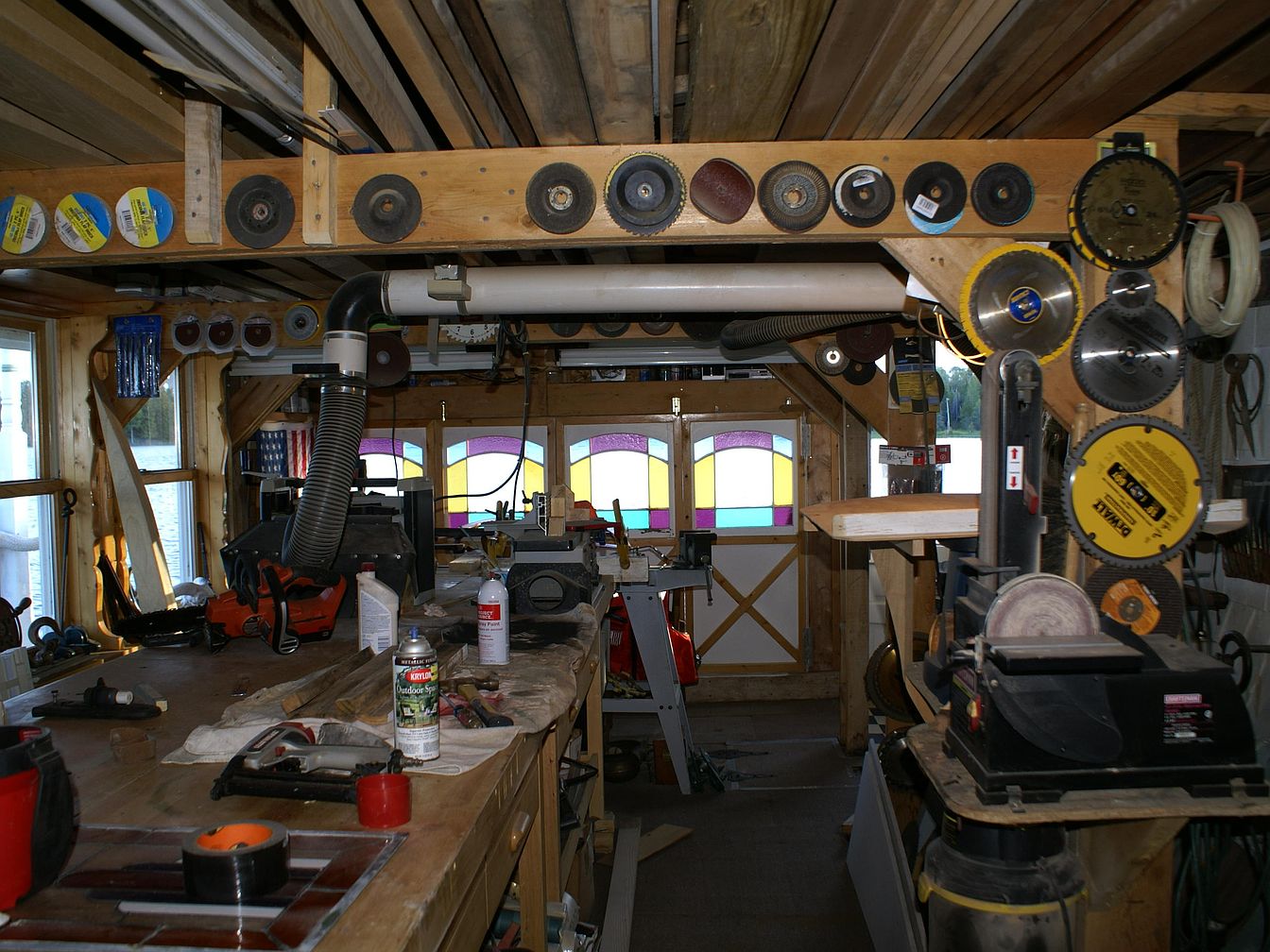 A spacious, organized workshop with exposed wood beams on the ceiling and walls. The central workbench is cluttered with tools, cans, and various supplies, giving the space a well-used, functional feel. Circular saw blades and grinding wheels are neatly mounted on wood beams, displaying the collection openly. Stained glass accents in purple, yellow, and blue brighten the double doors, adding a touch of color and vintage charm to the otherwise earthy palette of natural wood. Power tools and storage containers fill shelves and surfaces, emphasizing the room’s practical, industrious purpose.