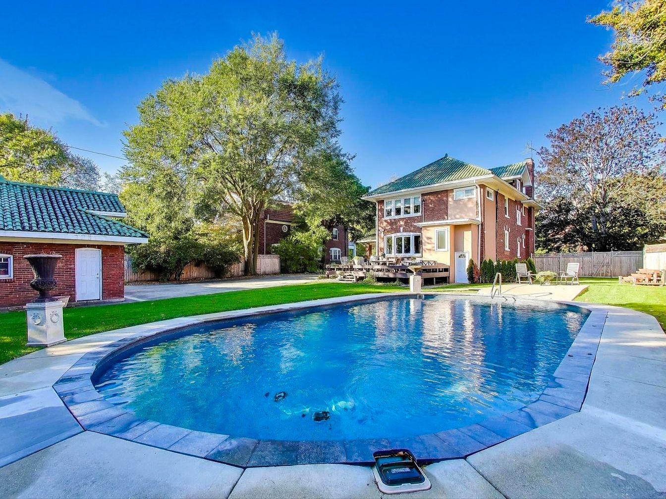 Expansive backyard featuring a large, oval-shaped in-ground swimming pool bordered by a wide, pale concrete deck. The bright blue pool stands out against the lush green lawn that surrounds it. In the background, a stately two-story brick house with a green-tiled roof presents early 20th-century architectural charm. An adjacent brick outbuilding with a similar tiled roof adds harmony to the space. Mature trees provide partial shade, and carefully placed urn planters add classic, decorative touches. The overall ambiance is inviting and serene, with the open sky and well-maintained landscaping enhancing the home’s historic appeal.