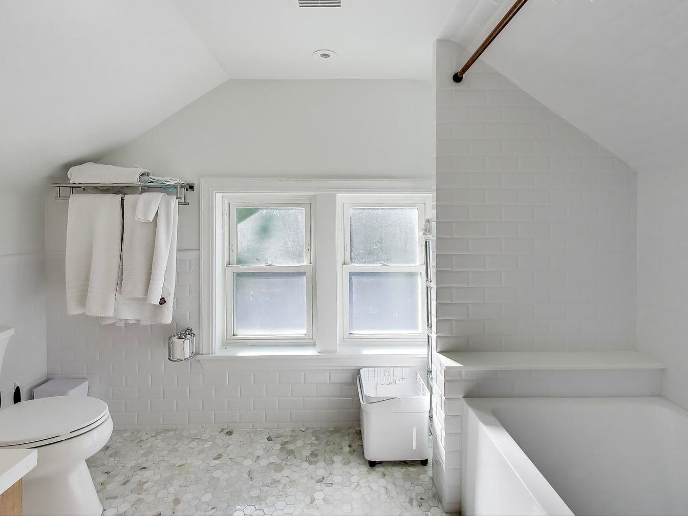 A bright and airy bathroom features clean white subway tiles covering the walls and a sloped ceiling giving the room a cozy feel. The floor is decorated with hexagonal marble tiles in varying shades of white and pale gray. There is a standard toilet in the left corner, and a chrome towel rack above holds neatly folded white towels. Double windows with divided panes let in soft daylight, illuminating the space. Next to the windows is a laundry basket on wheels, tucked beside a built-in bathtub. The minimalist aesthetic and muted color scheme create a serene, spa-like atmosphere.