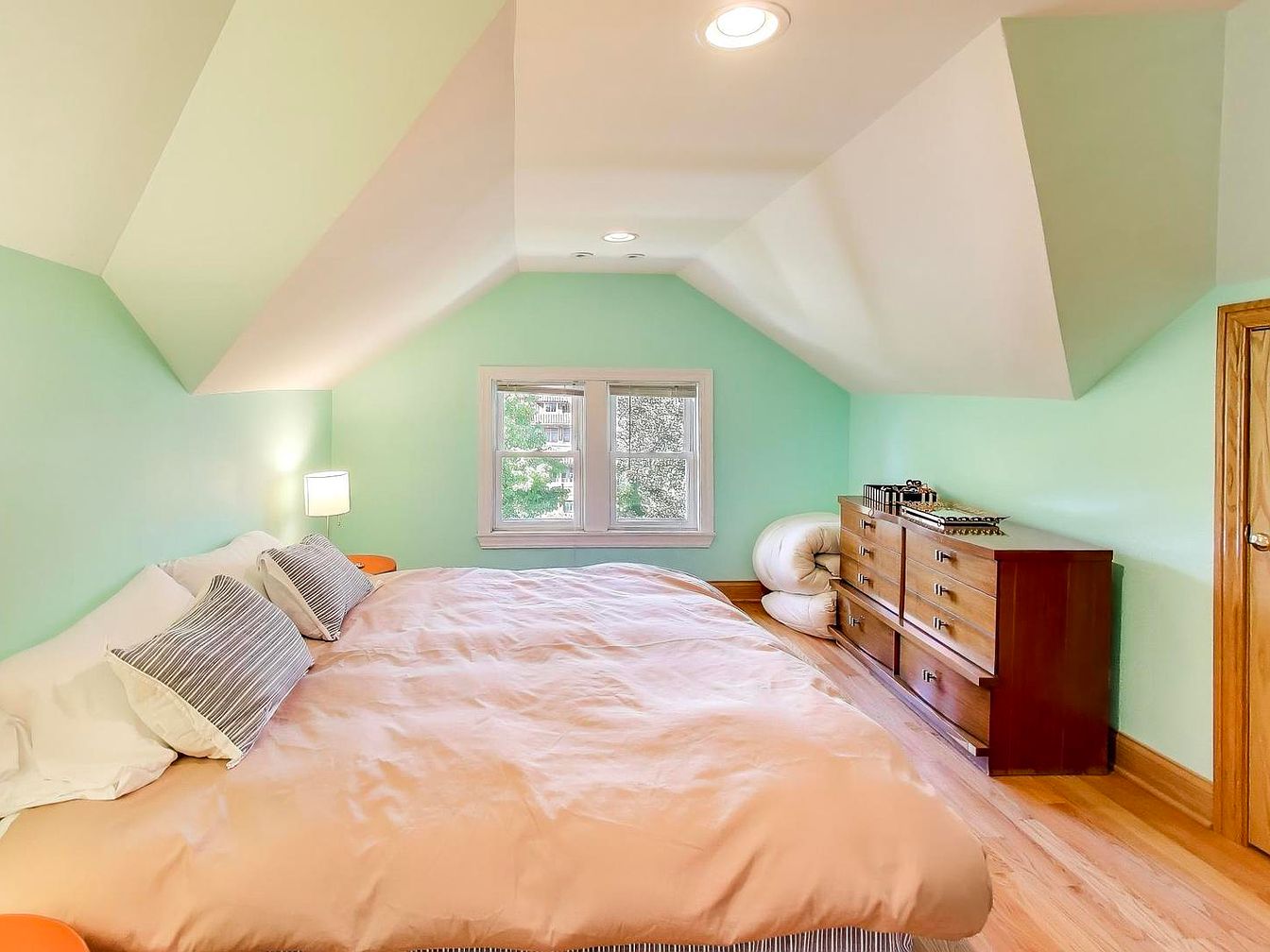 A cozy bedroom tucked under a sloped ceiling with soft mint-green walls, warm wood trim, and honey-toned hardwood floors. A large, inviting bed with a pale pink comforter and striped accent pillows sits against one wall, accompanied by two small orange nightstands and simple lamps. Across from the bed is a classic wooden dresser with sleek horizontal lines, decorated minimally. Light streams through a double window, brightening the room and highlighting a plush, circular white chair nestled in the corner. The space feels airy and serene thanks to pastel colors, minimalist furnishings, and abundant natural light.