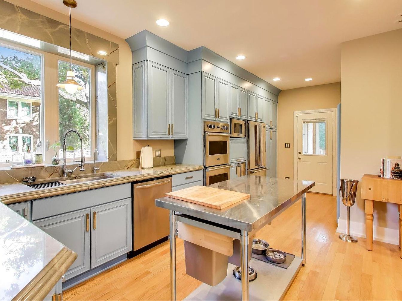 This kitchen features soft blue cabinetry with raised panel doors, brass hardware, and elegant marble countertops. Stainless steel appliances, including a double oven and large refrigerator, line the wall for a sleek, contemporary feel. A broad window over the sink lets in natural light and overlooks a lush, leafy yard. The island in the center has a polished stainless steel surface and a wooden cutting board on top, with storage shelves and pet bowls underneath. Blonde hardwood flooring runs throughout, and recessed ceiling lights provide ample illumination. Warm neutral walls and a minimalist backsplash complete the airy, inviting space.