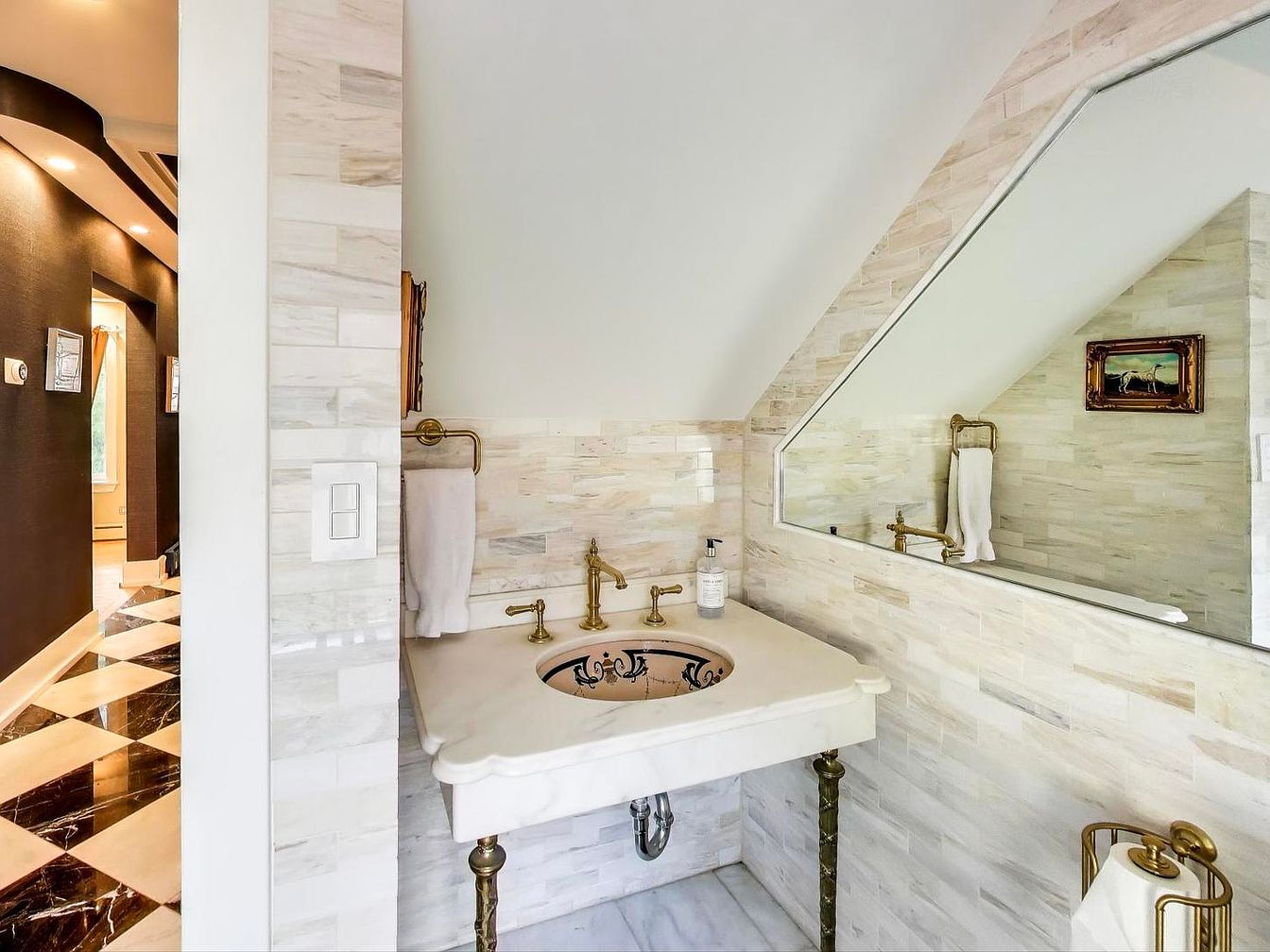 A small powder room features a white marble vanity nestled under a sloped ceiling, creating a cozy corner. The countertop and backsplash continue the light, creamy marble tile motif, giving the space a bright and serene atmosphere. Brass fixtures, including the faucet, towel holder, and toilet paper holder, add a touch of vintage elegance. A large, angular mirror follows the lines of the roof, reflecting light and visually expanding the space. A delicate gold-framed art piece and rolled white towels bring warmth and character to the room, while the checkered marble hallway beyond adds dramatic contrast and visual interest.