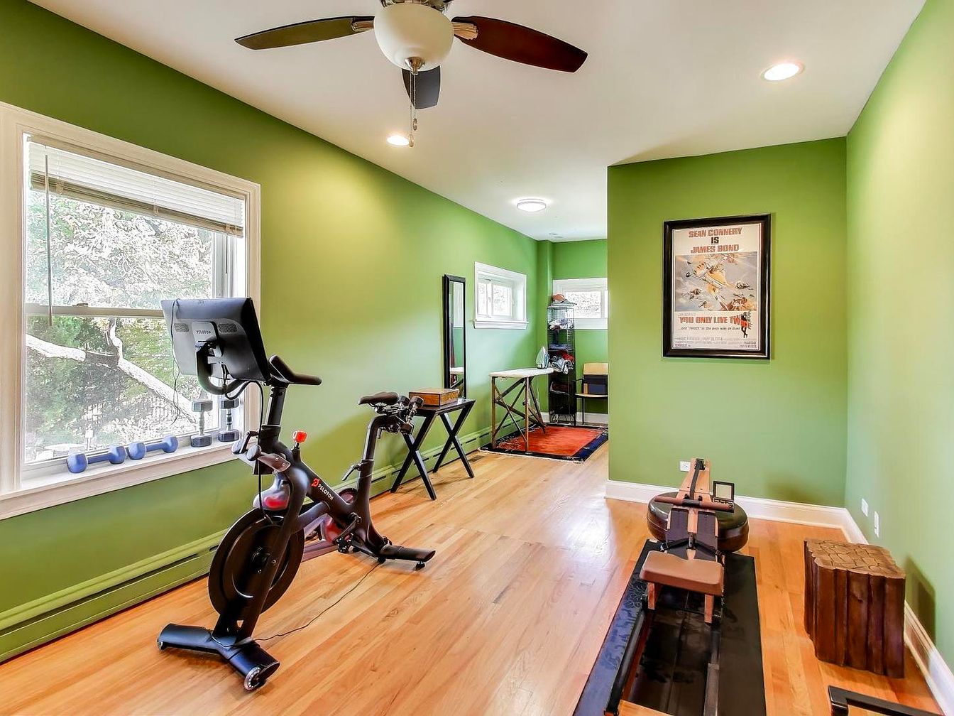 A long, narrow room painted in vibrant green houses exercise equipment, including a Peloton bike near a window on the left side, and a wooden rower positioned on a black mat along the right. Natural light pours in through tall and small horizontal windows, highlighting the light hardwood floors. A row of blue dumbbells sits on the windowsill, and a rustic wooden stump functions as a small side table. There is a sleek black framed mirror and a vintage James Bond movie poster on the wall, adding personality. A cozy rug, a small desk, and open shelving create a multi-functional exercise and relaxation area.