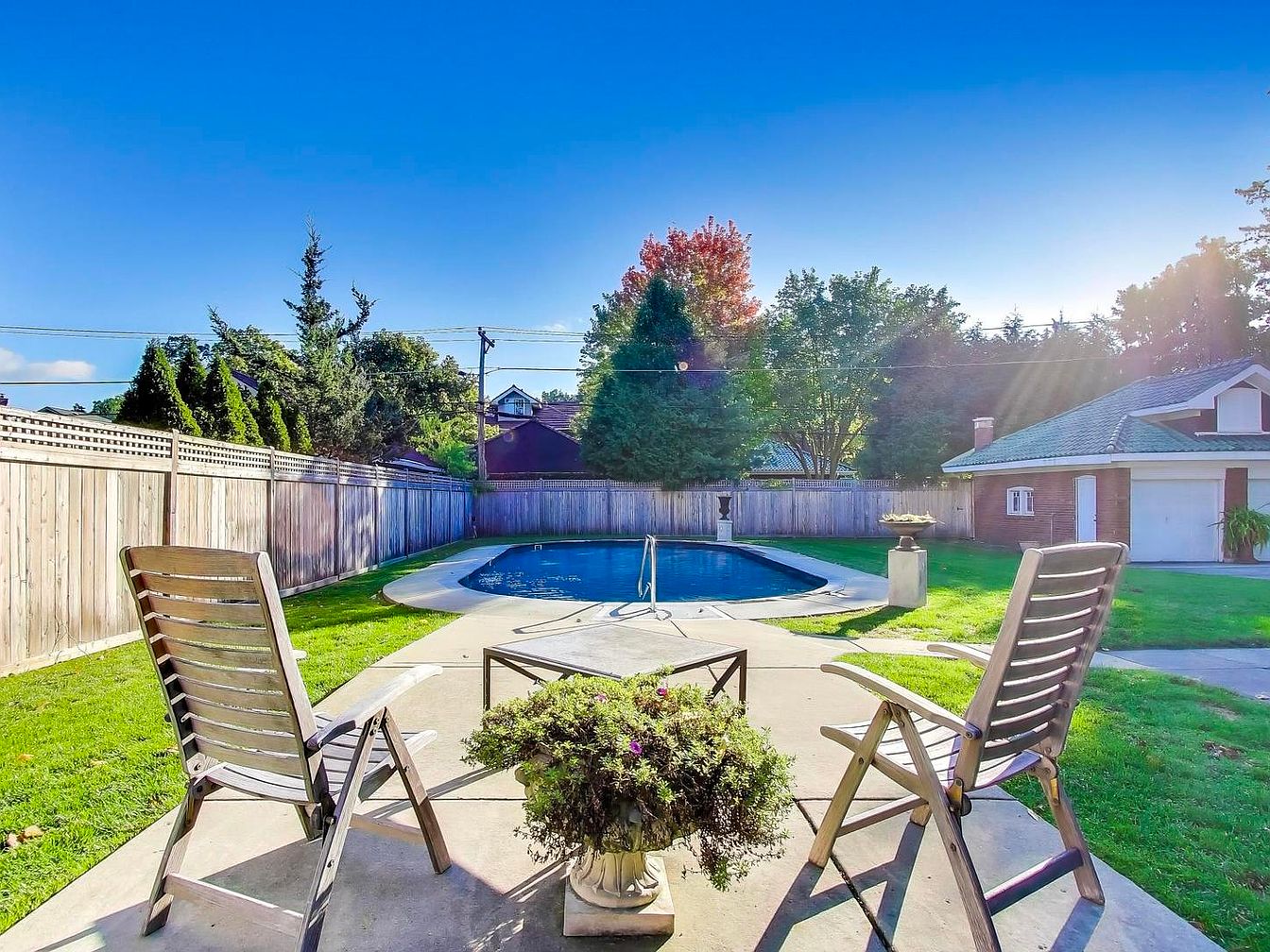A serene outdoor space features a rectangular in-ground swimming pool surrounded by a wide paved concrete path. Two wooden lounge chairs with slatted backs face the pool, positioned on either side of a small metal accent table topped with a lush planter overflowing with greenery. The fenced yard is bordered by light wood fencing and lush green grass, framed by mature trees with a mix of summer green and autumn red foliage. The detached brick garage sits to the right, its white doors and pitched roof adding classic charm. Bright, clear blue skies enhance the tranquil, inviting atmosphere.
