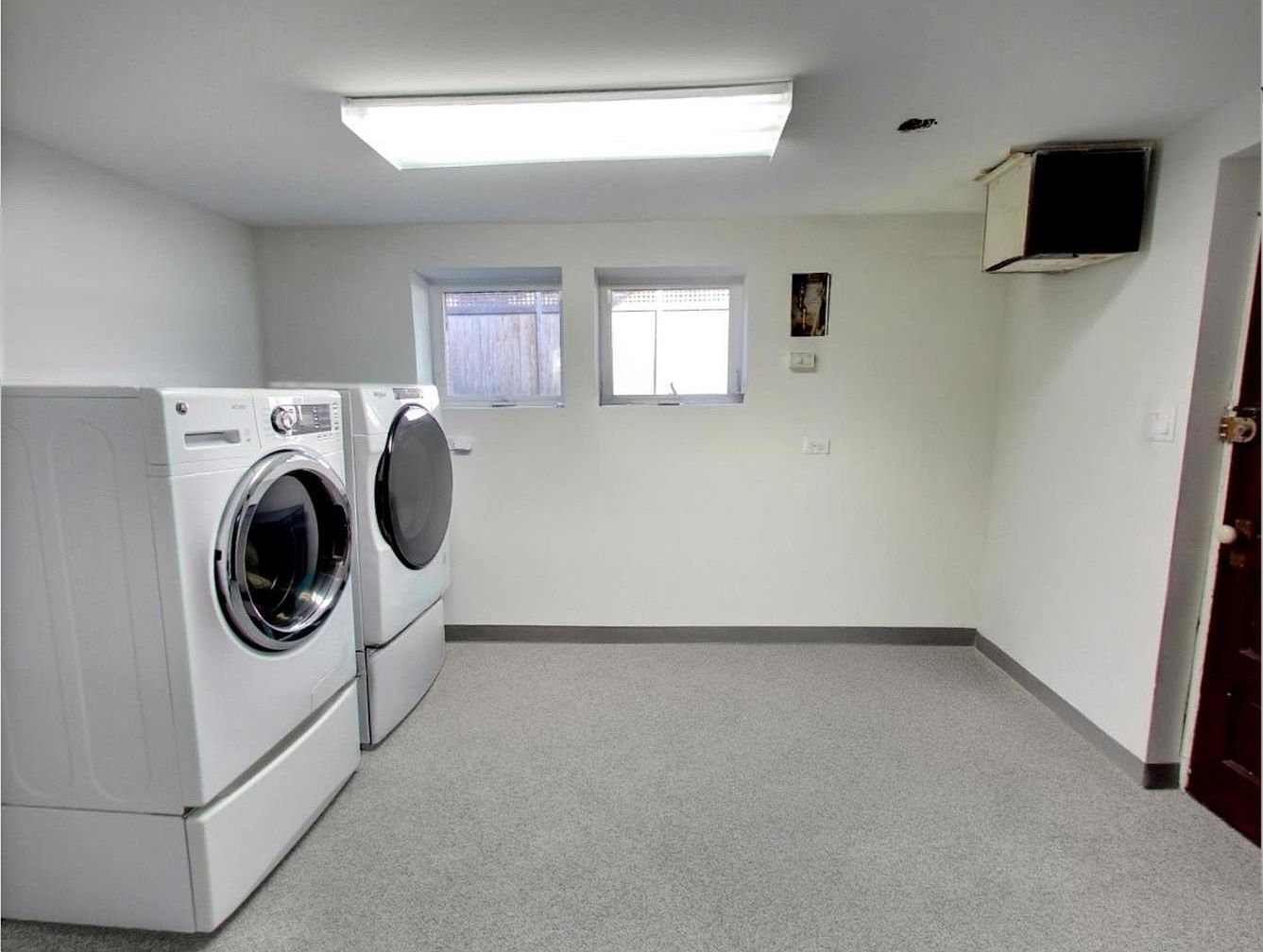 A functional, utilitarian laundry room featuring a front-loading washer and dryer set side by side against one wall. The space is illuminated by a large rectangular fluorescent ceiling light, creating a bright workspace. Two small rectangular windows above the appliances let in some natural light, partially covered from the outside. The walls are painted a clean white, complemented by gray trim and baseboards, and the flooring is covered in smooth, light gray linoleum or vinyl for easy cleaning. The room feels spacious, uncluttered, and optimized for practicality, emphasizing utility over ornate decoration.