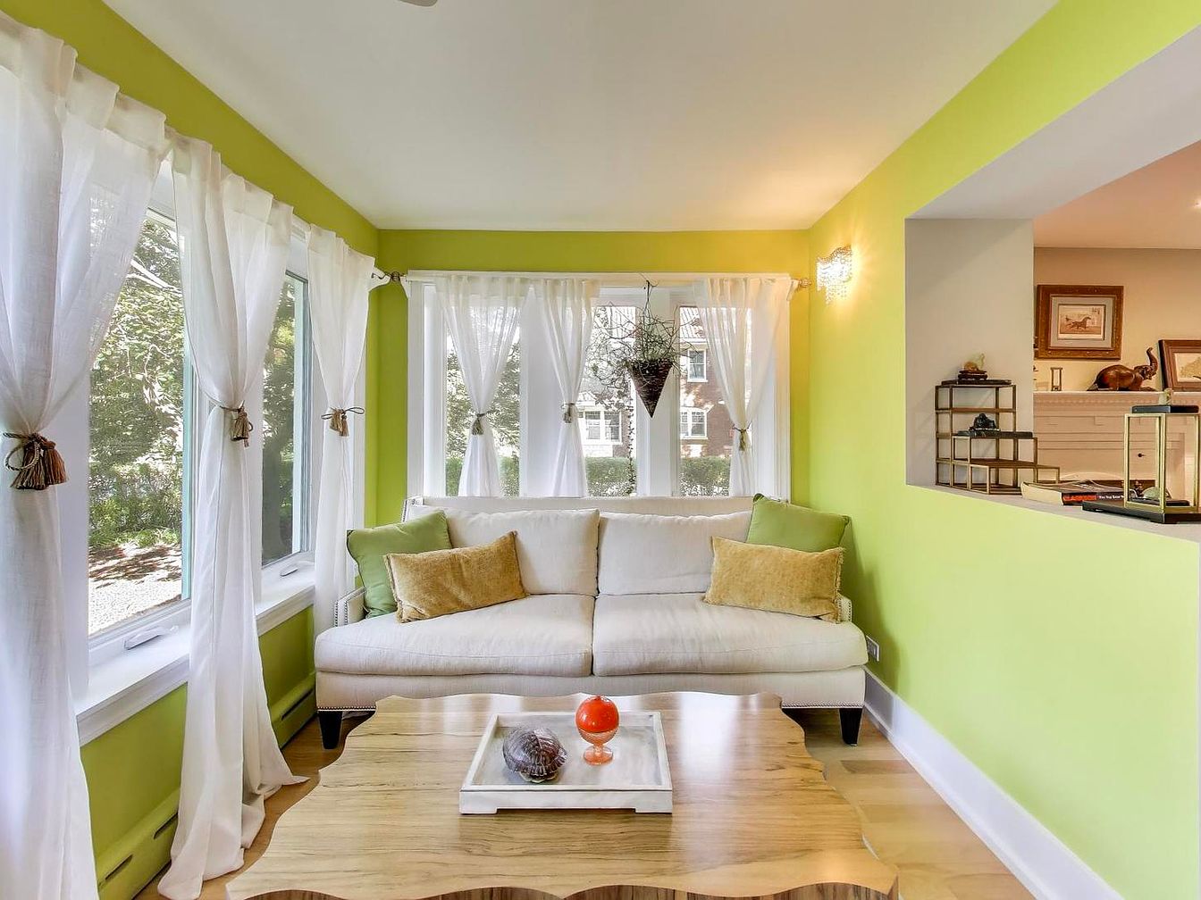 A cozy sunroom features pale green walls that brighten the space and complement the abundant natural light streaming through three large windows. Sheer white curtains, loosely tied with brown tasseled cords, add a delicate and airy feel. A soft, off-white loveseat sofa is adorned with sage green and golden yellow accent pillows, creating a gentle color harmony. In front of the sofa sits a light wood coffee table with smooth, curved edges and a decorative tray holding a few small objects, including a single orange fruit. An open wall cutout reveals glimpses of a neighboring room with eclectic decor and framed artwork.