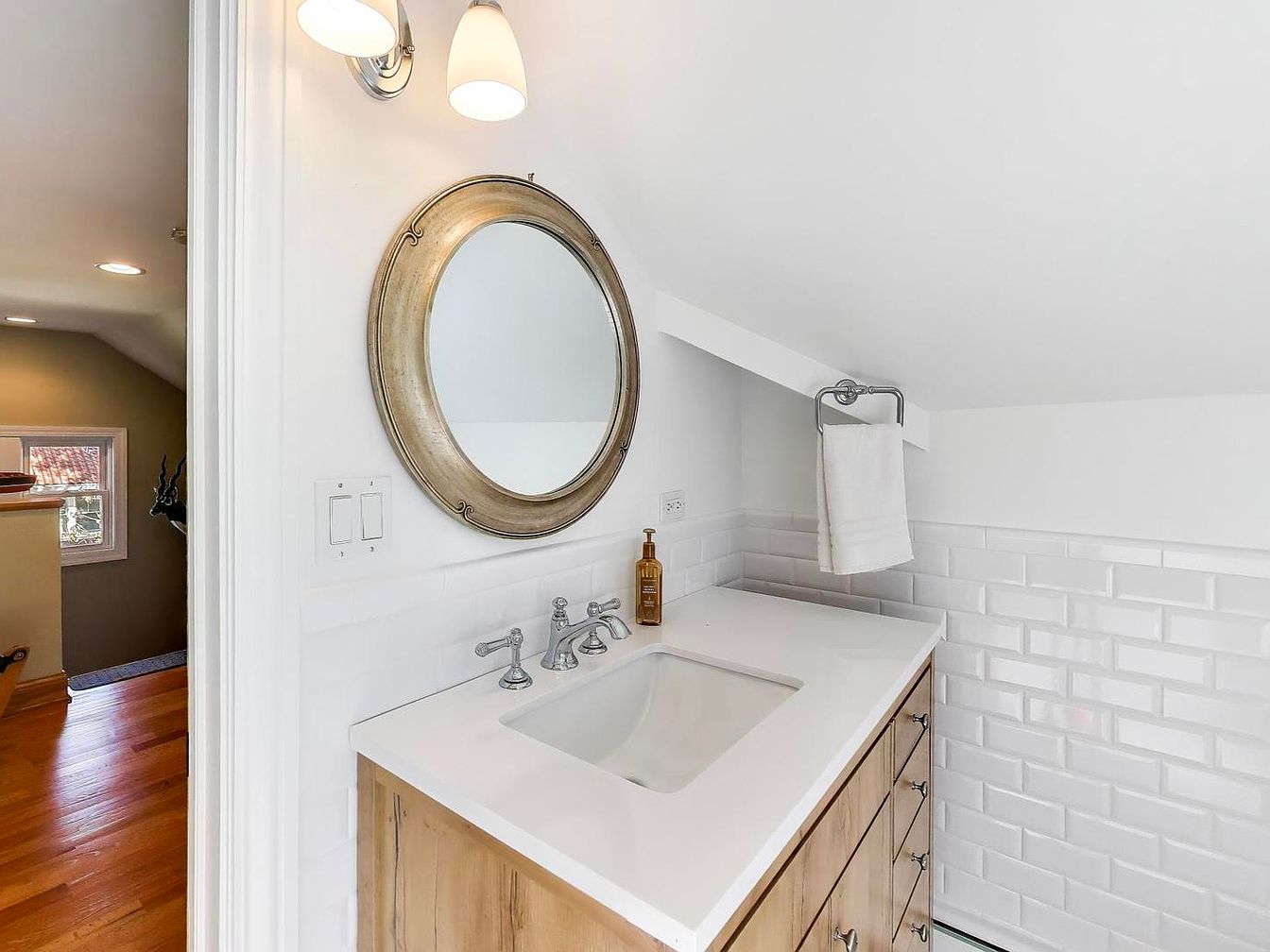 A cozy bathroom corner features a sleek white countertop atop a light wood vanity with multiple drawers. The sink has modern silver fixtures, and above it hangs a large, round, antique-style mirror framed in weathered gold. Glossy white subway tiles line the wall, while a chrome towel ring holds a neatly folded white towel. Soft ambient light from a twin sconce fixture brightens the clean, bright space. The sloped ceiling and crisp white walls give the room an intimate, attic-like feel. Just outside, light wood floors and a muted olive wall add warmth and contrast to the cool bathroom palette.
