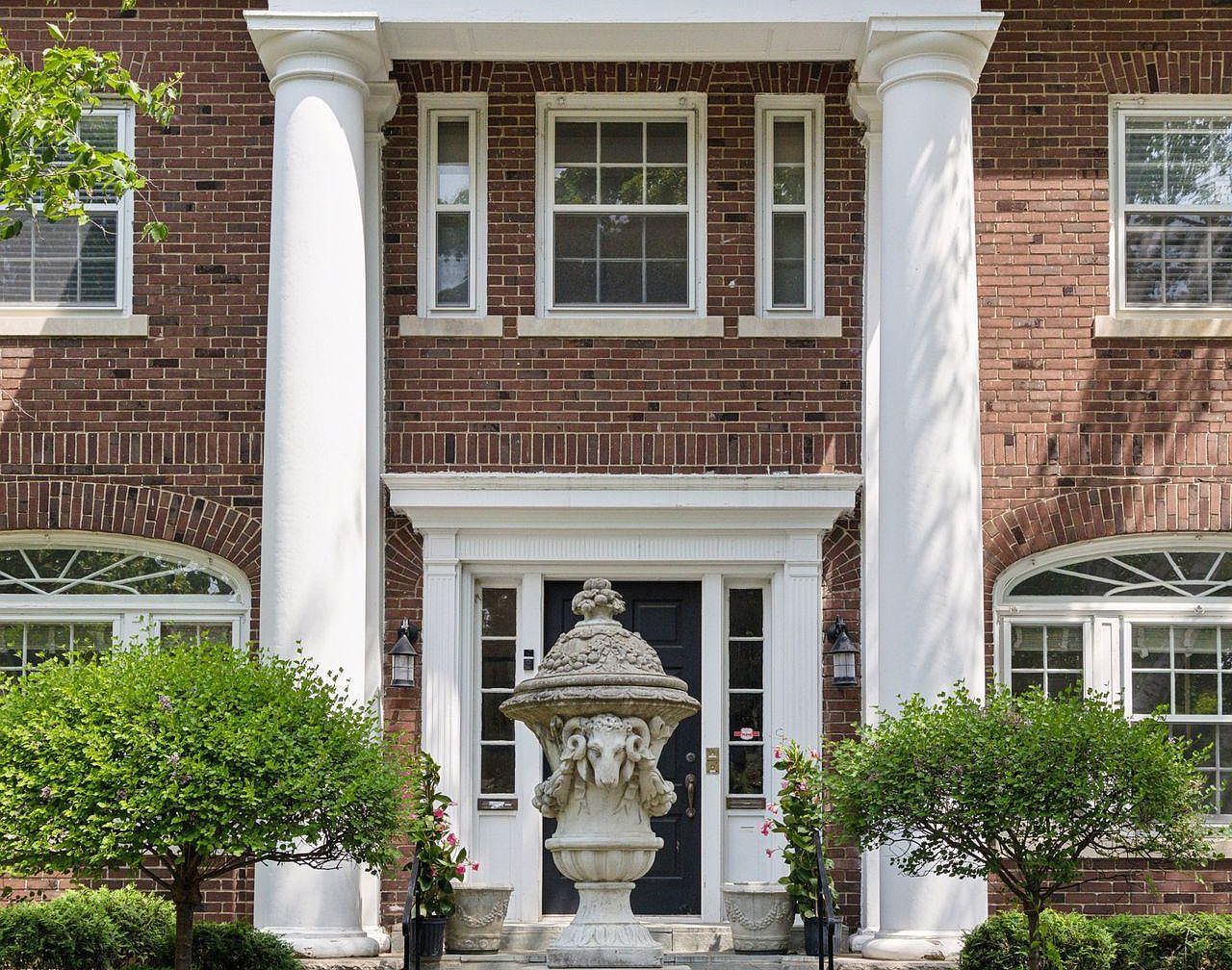 A stately historic home is seen from the street, partially obscured by large, mature trees and manicured hedges. The façade features classic brickwork and arched windows, with lush greenery providing a sense of privacy and charm. A broad staircase, flanked by low brick pillars and trimmed boxwood, leads to the entryway. Decorative urns and a traditional black lamppost enhance the period feel of the property. The house is framed by neighboring homes, but the focus remains on the symmetrical entry garden and dignified architecture, which exude timeless elegance and a welcoming, established character.