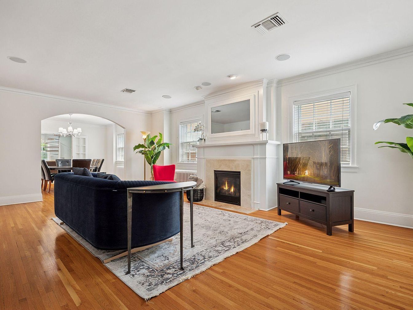 A spacious living room features honey-toned hardwood flooring and soft white walls that enhance natural light from multiple windows. A classic fireplace serves as the focal point, topped with a large framed mirror. The room contains a plush, deep blue velvet sofa, accented by a single bright red modern chair. A patterned area rug anchors the seating area. A large black media console holds a flat screen television, while tall green potted plants on either side bring a natural element indoors. The room seamlessly opens into a formal dining area through a broad arched entryway, giving an airy, open feel.