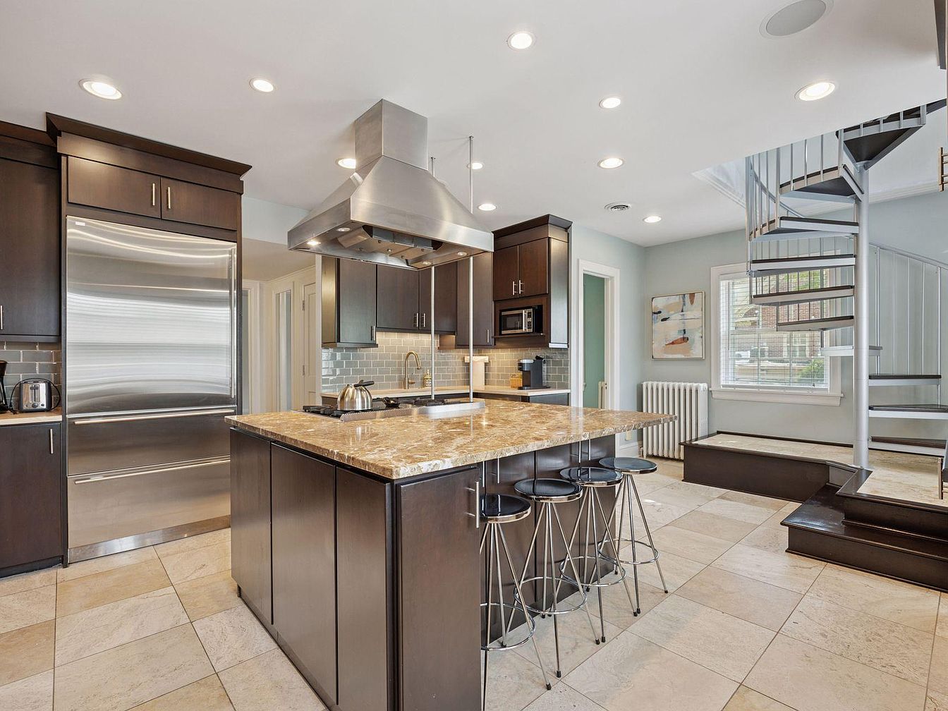 A spacious kitchen features a large central island with a striking marble countertop and several modern black barstools with metal legs. The cabinetry is dark wood, providing a rich contrast with the light beige tiled floor. Stainless steel appliances, including a large refrigerator and range hood, add a contemporary touch, while subway tile backsplash lines the walls behind the countertops. Recessed lighting in the ceiling illuminates the area brightly. To the right, a white spiral staircase leads to an upper level, and a window allows natural light into the space. Abstract wall art and a classic radiator complete the room’s look.