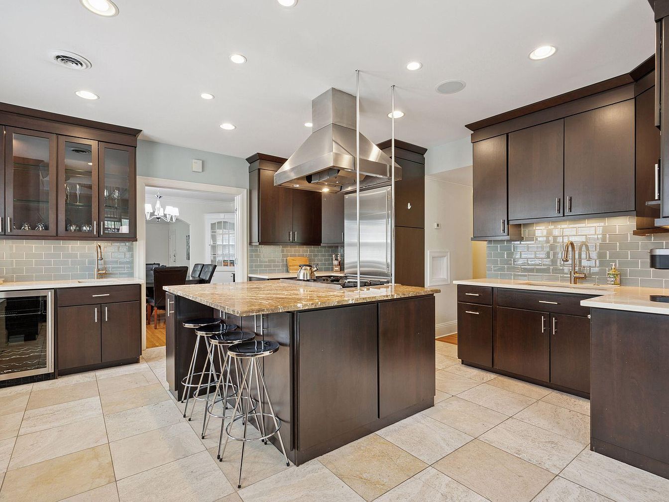 Spacious modern kitchen with large central island topped in a rich, marbled stone, surrounded by three sleek metal barstools. Dark wood cabinetry provides a contemporary contrast to the light beige tiled floor and pale gray glass subway tile backsplash. Stainless steel accents, including a prominent vent hood and appliances, enhance the modern touch. Ample ceiling spotlights provide bright illumination. To the left, glass-fronted cabinets display glassware, while to the right, under-cabinet lighting highlights a secondary counter space with a mounted gold faucet. The open doorway leads to a formal dining room with a large chandelier and elegant furnishings visible.