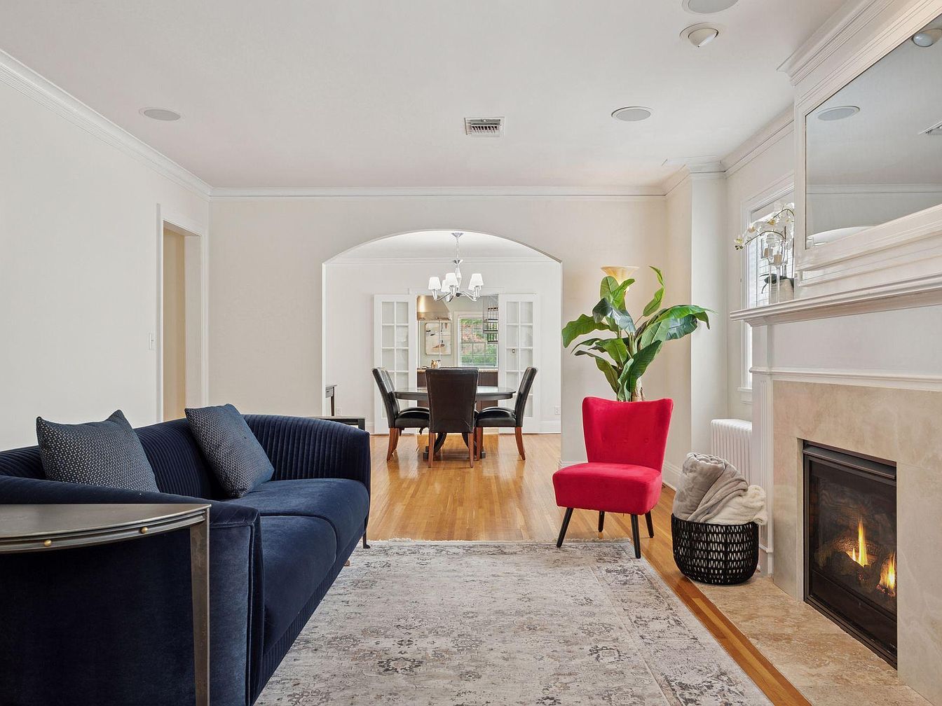 A bright and inviting living room features a rich navy velvet sofa with matching textured pillows and a striking hot pink accent chair angled toward the fireplace. The fireplace is set in a light marble surround beneath a white mantel with built-in shelving that holds small decorative items and an orchid. A large, leafy green plant in a floor-standing pot adds a burst of freshness next to the accent chair. The hardwood floors are partly covered by a faded, patterned area rug in soft neutrals. White trim, crown molding, and walls create a clean, classic look, while an arched doorway leads into a dining room with a modern chandelier and glass-paned doors.