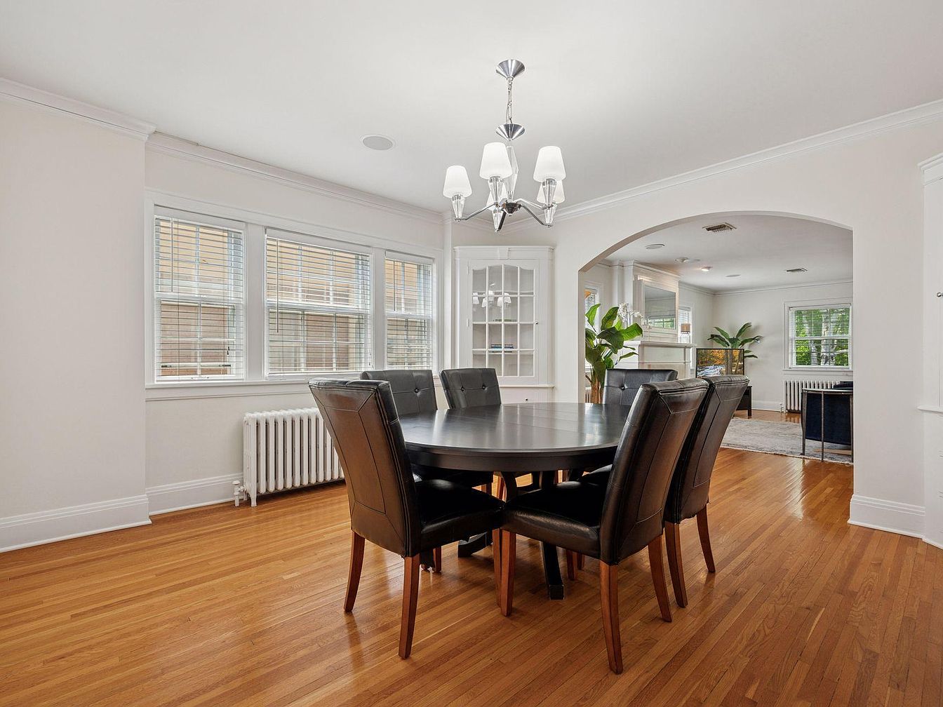 A bright dining space features a round, dark wood table paired with six black leather chairs, all resting on warm, honey-toned hardwood floors. The walls are painted soft white, adding to the airy atmosphere created by three large windows with white wooden blinds. A modern chrome chandelier with white shades hangs centrally above the table. Crown molding and white trim accentuate the clean architectural lines. Through a wide arched opening, the adjoining living room is visible with more windows, green houseplants, and a cozy sitting area, reinforcing the open, historic home layout and blending traditional charm with modern touches.