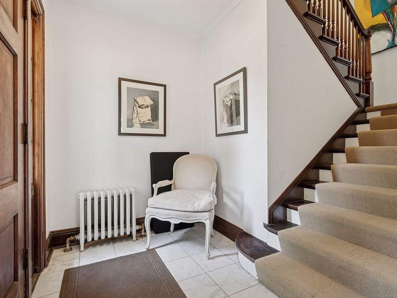 A welcoming entrance area featuring a staircase with plush beige carpeting and rich dark wood trim. The walls are painted a soft white, providing a bright and airy feel, accented with two framed abstract prints displayed above a classic cream-upholstered armchair positioned beside a vintage white radiator. The floor is finished with white marble tiles and a brown woven mat, adding both texture and warmth. Elegant woodwork frames the door and stairs, while the stair balustrade shows fine traditional detailing. Upstairs, a splash of color from contemporary artwork is just visible, hinting at a blend of traditional and modern aesthetics throughout.