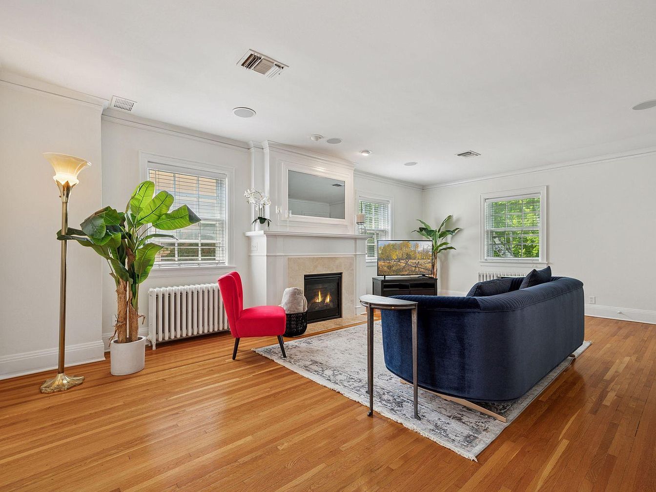 Spacious living room featuring honey-toned hardwood floors and crisp white walls. A classic white mantle fireplace serves as the focal point, flanked by two double-hung windows letting in abundant natural light. The room is furnished with a deep blue velvet curved sofa placed atop a modern area rug, facing the fireplace. A striking bright red accent chair provides contrast and visual interest. Potted green plants at both corners introduce freshness and warmth, while a brass floor lamp adds ambient light. Large windows, period radiator, and subtle crown molding highlight the historic character of the space, achieving a bright, welcoming atmosphere.