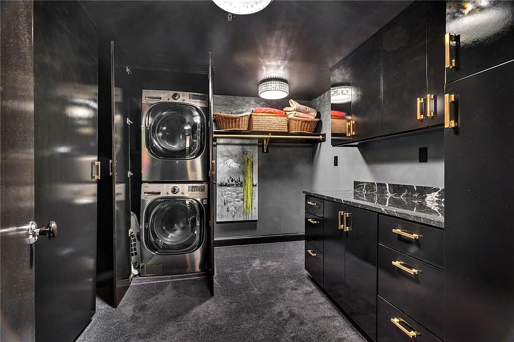 This laundry room features sleek black cabinetry coupled with polished gold hardware, creating a contemporary and luxurious ambiance. The space includes a stacked washer and dryer, neatly tucked away behind cabinet doors, maximizing functionality. A dark marble countertop serves as a stylish surface for folding clothes, while a wooden shelf above holds neatly arranged baskets and towels. The walls are painted a deep gray that enhances the room’s modern design, and a striking ceiling light fixture adds a touch of elegance. The plush black carpet underfoot offers warmth, enhancing the overall richness of the aesthetic.