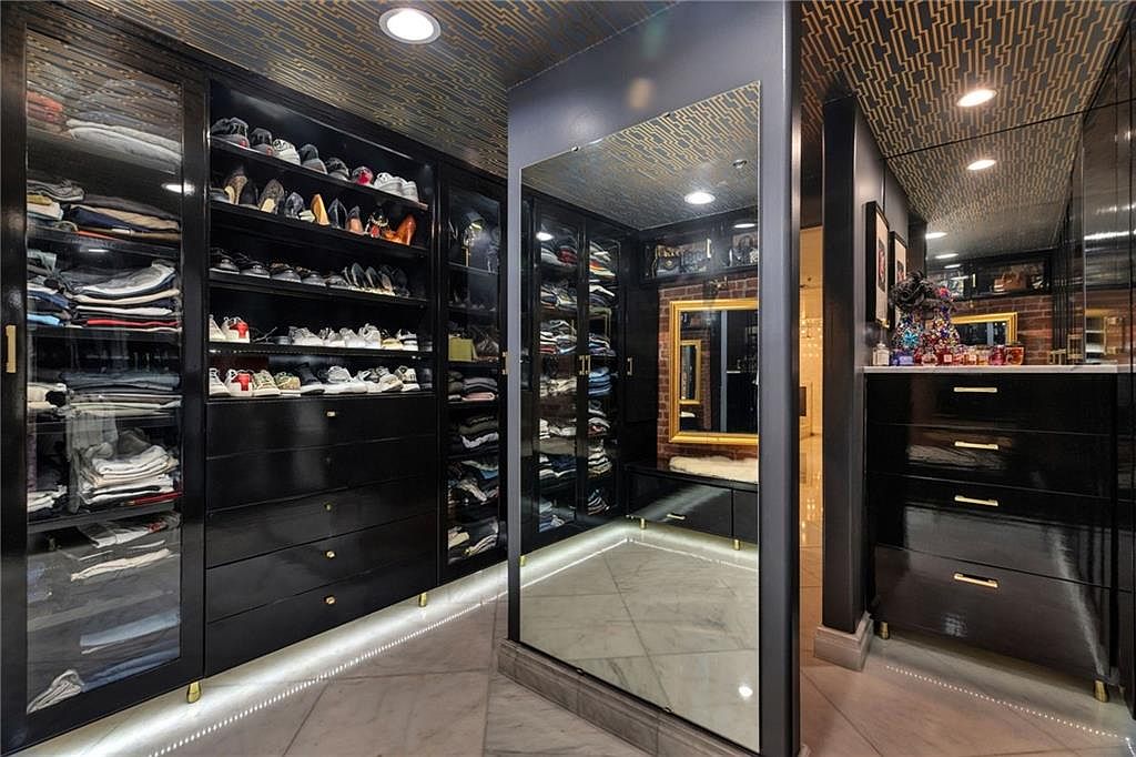 This luxurious walk-in closet features sleek black cabinetry with transparent doors showcasing neatly organized clothing and shoes. Gold hardware adds elegance, contrasting with the dark finishes. A mirrored wall amplifies the space, reflecting stylish design elements. The ceiling boasts a unique patterned design, enhancing the overall aesthetic. Marble flooring, with subtle lighting along the base, underscores a modern feel. A chic vanity area complements the organization of the closet, adorned with decorative items. The combination of rich colors and sophisticated textures creates a high-end atmosphere, making this space both functional and visually appealing.
