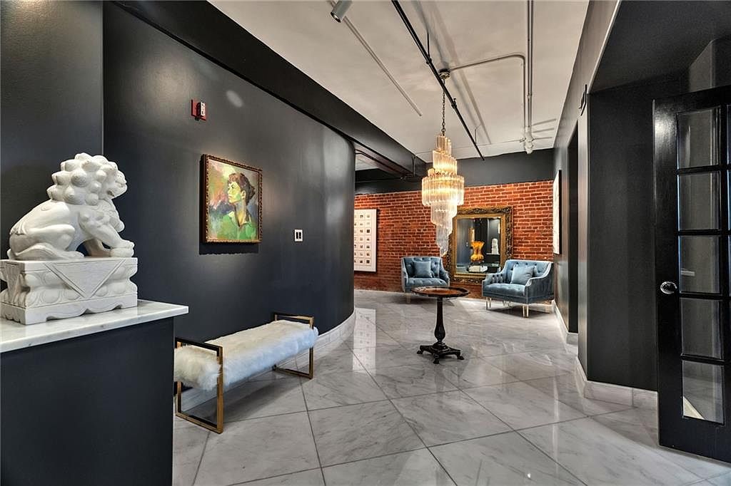 The entry hallway features a striking blend of modern and classic elements. Dark, charcoal walls contrast with glossy white marble flooring, creating a dramatic effect. A plush white bench with gold accents offers seating beside a sculptural lion figure made of marble. An ornate chandelier casts a warm glow from above. Two sky-blue velvet chairs provide a pop of color, inviting relaxation. The exposed brick wall adds a rustic charm, complementing the contemporary artwork above. Architectural details include sleek black trim around the door, enhancing the space’s elegant feel. Unique art pieces and decor punctuate the room’s aesthetic.