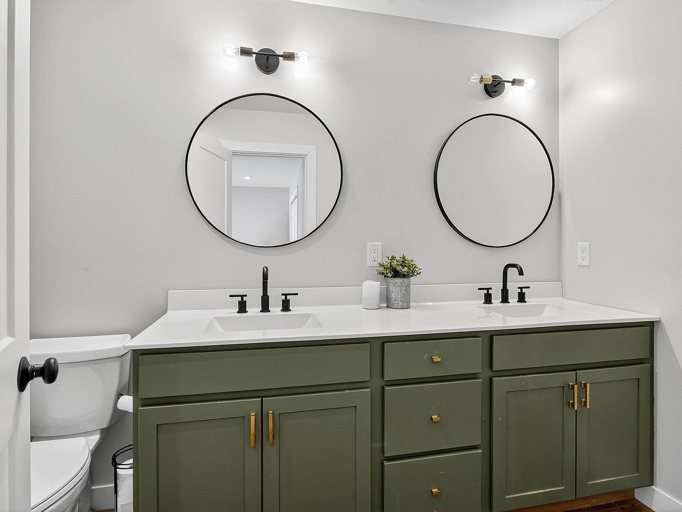 A bathroom vanity featuring two round black-rimmed mirrors positioned above a wide double sink with a white countertop. The cabinetry is painted in a muted olive green shade with brass hardware, adding a stylish contrast against the crisp white counter and walls. Matte black faucets complement the mirrors and lighting fixtures above, which provide soft illumination. To the left is a toilet, partly visible, and small decorative touches like a potted plant and a candle offer a touch of warmth and personality. The space feels modern, clean, and well-organized while retaining a subtle vintage charm through its color choices and fixtures.