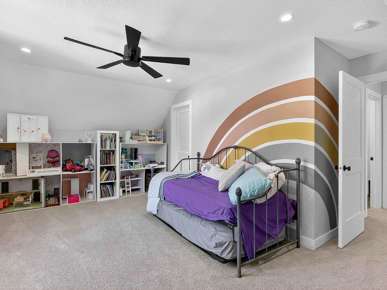 A child’s bedroom with light gray carpet and slanted ceiling, accented by a playful wall mural featuring oversized rainbow arches in muted earth tones of ochre, tan, gold, brown, and gray. A black metal daybed sits against the mural wall with bright purple bedding and an array of pastel pillows. Across from the bed, cubby shelves hold books, toys, and dollhouses, while a tall white bookshelf is filled with more books and crafts. The room is airy and cheerful, with recessed ceiling lights, a modern black ceiling fan, and white trim and doors, creating a fresh, youthful ambiance.