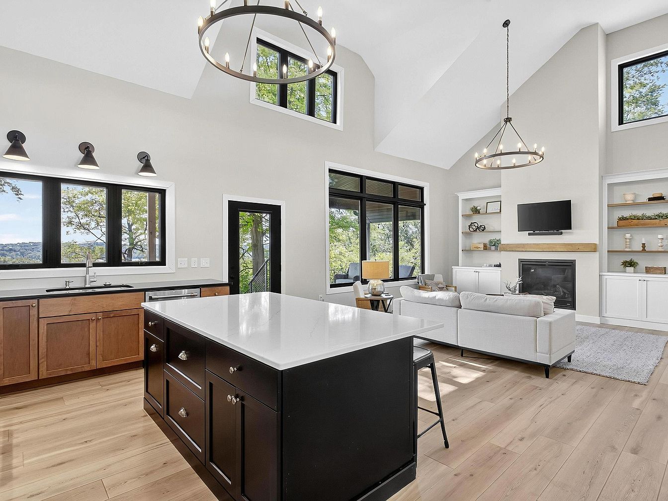 A spacious open-concept kitchen flows seamlessly into a light-filled living room. The kitchen features a large island with a white countertop, dark cabinetry, and bar seating. Wood cabinets line the back wall under a row of three matte-black light fixtures and windows offering a treetop view. The living area includes a modern white couch, soft rug, and built-in shelving flanking a sleek fireplace with a wood mantel. Tall ceilings, expansive windows, and light wood flooring create an airy, welcoming atmosphere, combining contemporary and classic elements for a clean yet warm aesthetic.