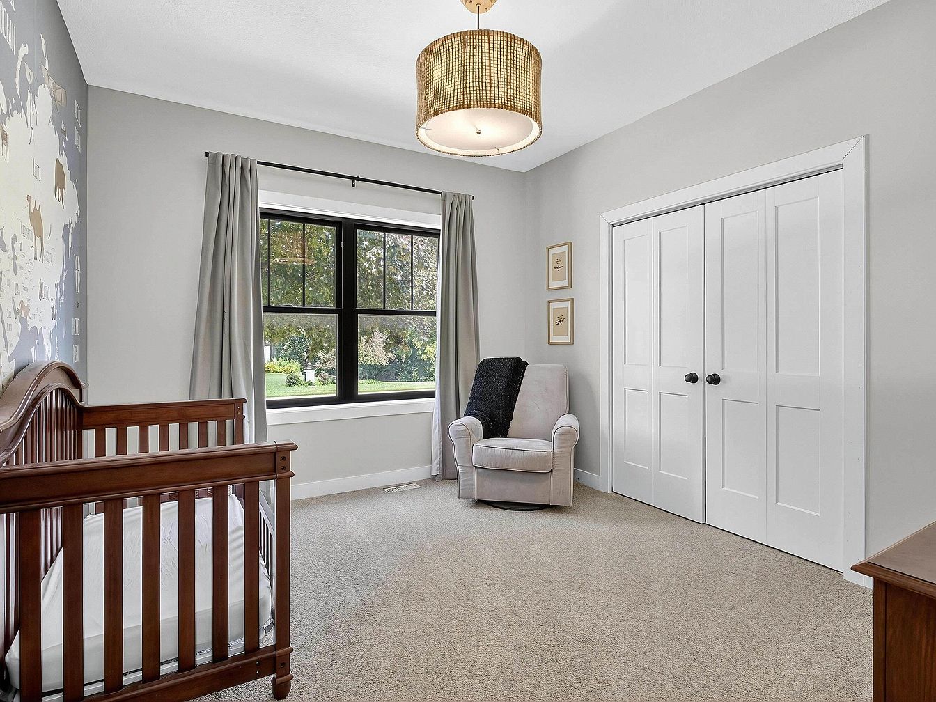 Soft gray walls and neutral carpeting create a calming backdrop in this spacious nursery. A dark wood crib sits to the left near a wall with a playful world map mural, adding a subtle educational touch. In front of a large black-trimmed window, pale gray curtains frame views of the garden outside, while natural light fills the space. An upholstered swivel chair with a cozy black throw rests by double closet doors, offering a comfortable spot for reading or feeding. The overall look is clean, minimal, and inviting, with gentle pops of warmth from the wooden furniture and woven light fixture overhead.