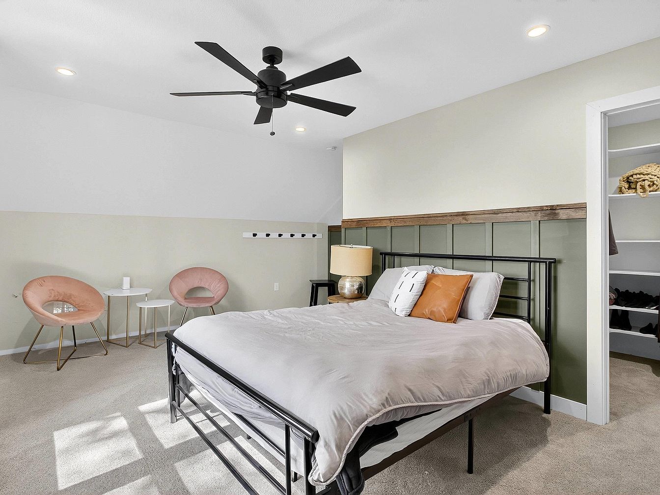 Soft natural light fills this bedroom, highlighting a harmonious blend of modern and cozy design elements. The focus is a neatly made bed with a black metal frame, grey bedding, and accent pillows in white and tan leather for subtle contrast. Behind the bed, a sage green wainscoted accent wall is topped with reclaimed wood trim, adding texture and warmth. The walls are painted in off-white above the wainscot and pale green below. To the left, two blush pink velvet accent chairs and nested gold side tables provide a chic sitting nook. A black ceiling fan and open closet enhance the modern, functional aesthetic.