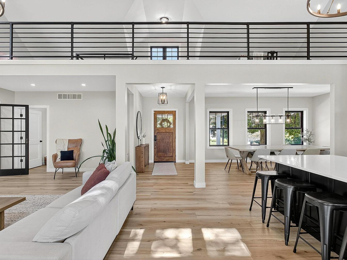 An open-concept space combines the entryway, living area, and dining zone, unified by light wood flooring and crisp white walls. The rustic wooden front door, framed by white trim, stands opposite a contemporary chandelier and a slim, wood entry table decorated minimally. To the left, a cozy sitting nook features a tan wingback chair and live plant, while a white sectional sofa with soft pillows defines the living area. The dining table, surrounded by modern upholstered chairs, sits under a linear light fixture before three black-trim windows. Black metal accents—railing upstairs, bar stools, and sliding door trim—add a modern industrial elegance.
