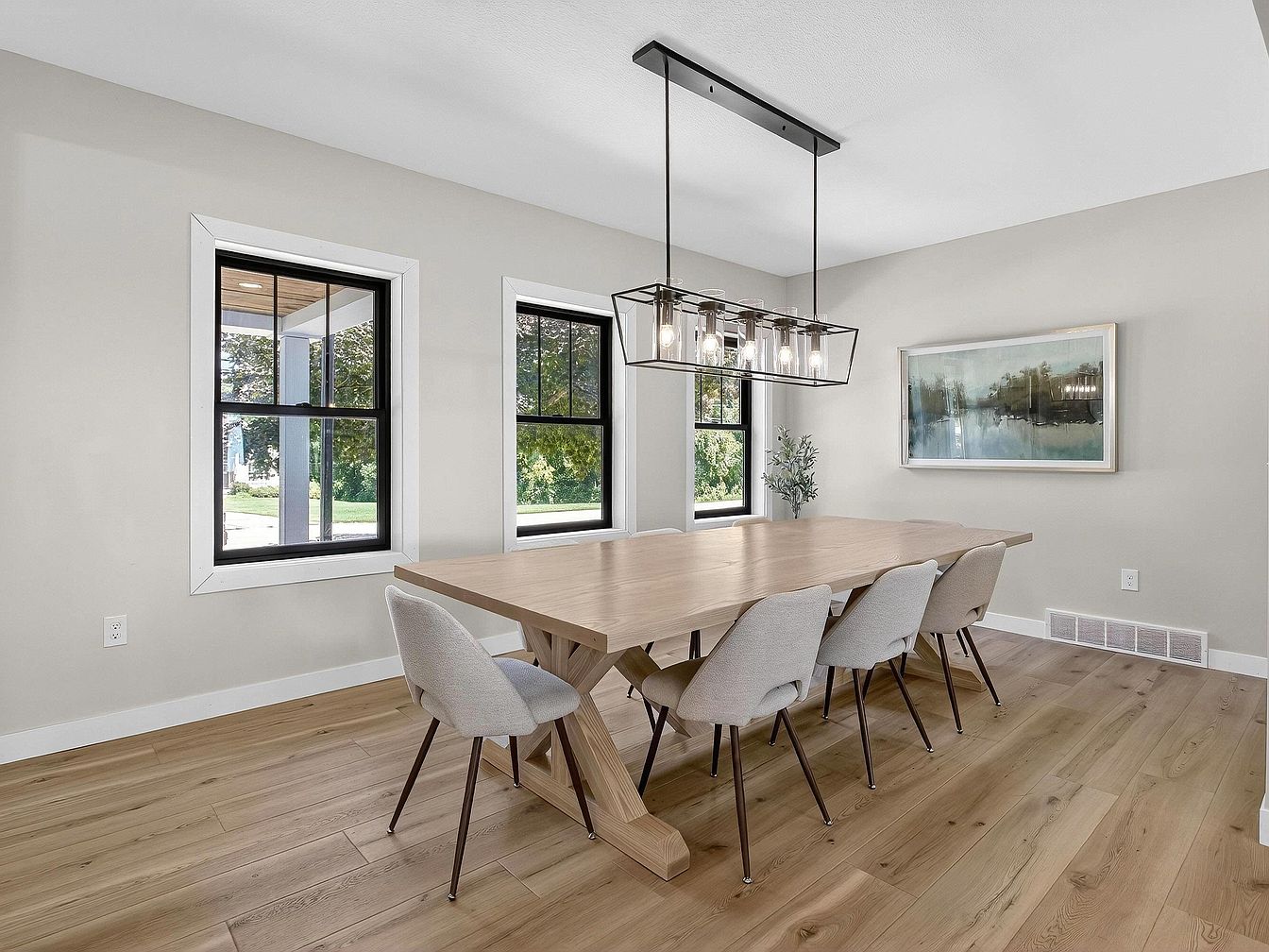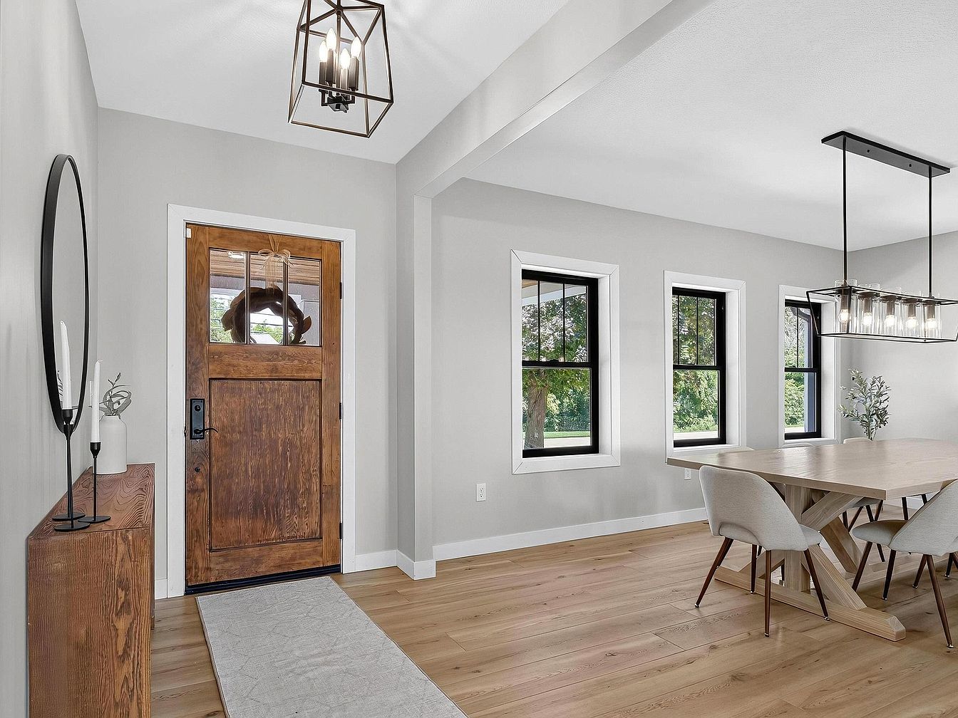 Upon entering through a rustic wooden front door with glass panes, the area opens to a spacious dining room filled with natural light from three large windows featuring black trim. The walls are painted a soft gray, creating a calming, neutral backdrop. Light-toned wood floors contribute warmth and continuity throughout the space. A minimalist wooden console table sits against the wall near the entrance, topped with understated decor including candles and a vase. The dining area includes a large, pale wood table paired with six modern, upholstered chairs. Geometric pendant lights, one above the entry and another above the dining table, add contemporary flair.