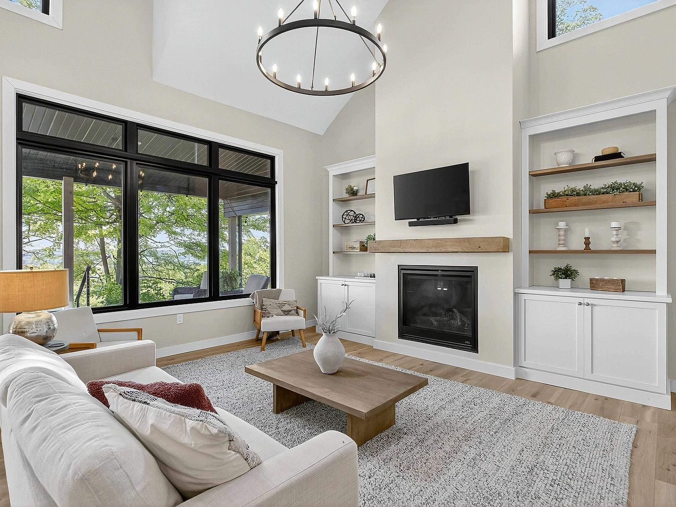 A spacious living room featuring a high vaulted ceiling and a large black-trimmed window that offers views of lush greenery outside. The room has a soft, neutral color palette with light beige walls, white built-in shelves, and a light wood floor. A contemporary chandelier with exposed bulbs hangs overhead. The fireplace is central to the arrangement, topped by a slim wooden mantel and a mounted TV. The furnishings include a cream-colored sofa accented with textured pillows, a modern armchair, a minimalist wooden coffee table, and a textured area rug, creating a cozy yet elegant atmosphere with natural light and subtle decorative touches.