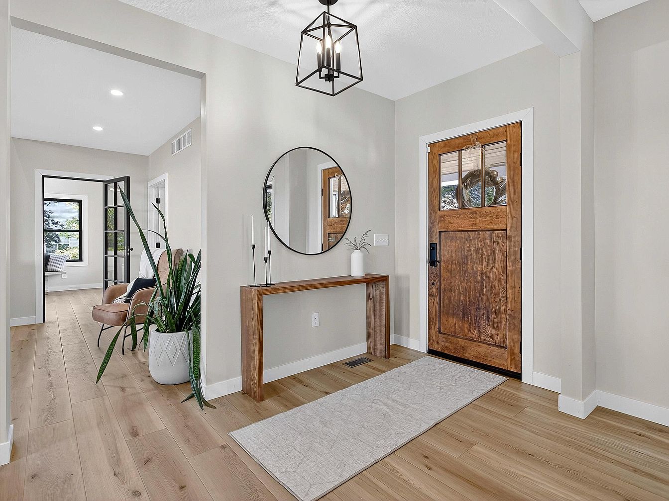 A welcoming entryway with a rustic wooden front door framed by white trim. The walls are painted a soft neutral beige, enhancing the natural light that fills the space. Light wood flooring extends throughout, paired with a simple runner rug. A contemporary wooden console table sits against the wall, topped with minimalist candle holders and a white vase. Above the console, a large circular mirror adds depth and reflects light. A tall potted plant in a textured white planter brings in greenery. To the left, a cozy reading nook with a leather accent chair and black-framed glass doors leads to another room.
