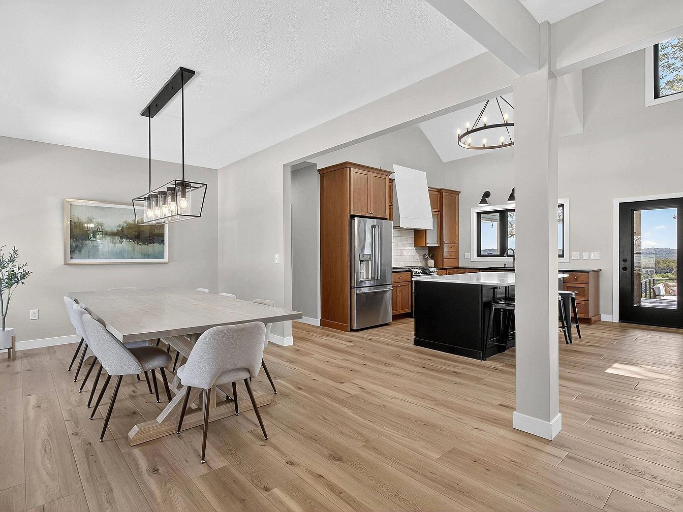 Spacious open-concept area with a smooth transition between the dining and kitchen spaces. The dining area features a large light wood table surrounded by cushioned light grey chairs, topped with a modern black metal chandelier. The kitchen boasts warm wood cabinetry, stainless steel appliances, a black island with sleek stools, and a bold ring-shaped chandelier above. Pale oak flooring runs throughout, enhancing the airy feel created by high ceilings, white walls, and large windows. Subtle artwork, a potted plant, and clean architectural lines contribute to the minimal, contemporary aesthetic with cozy, natural undertones.