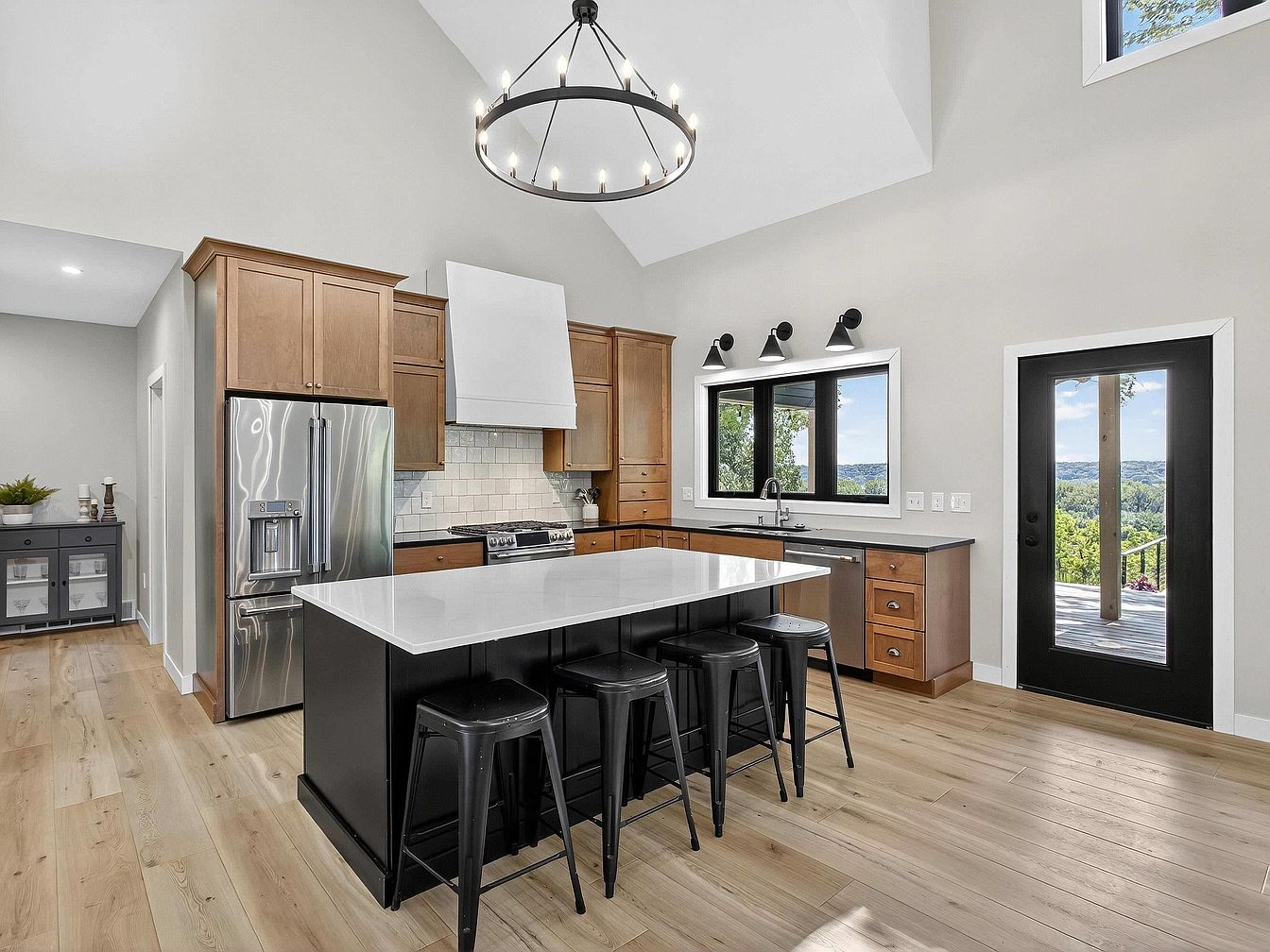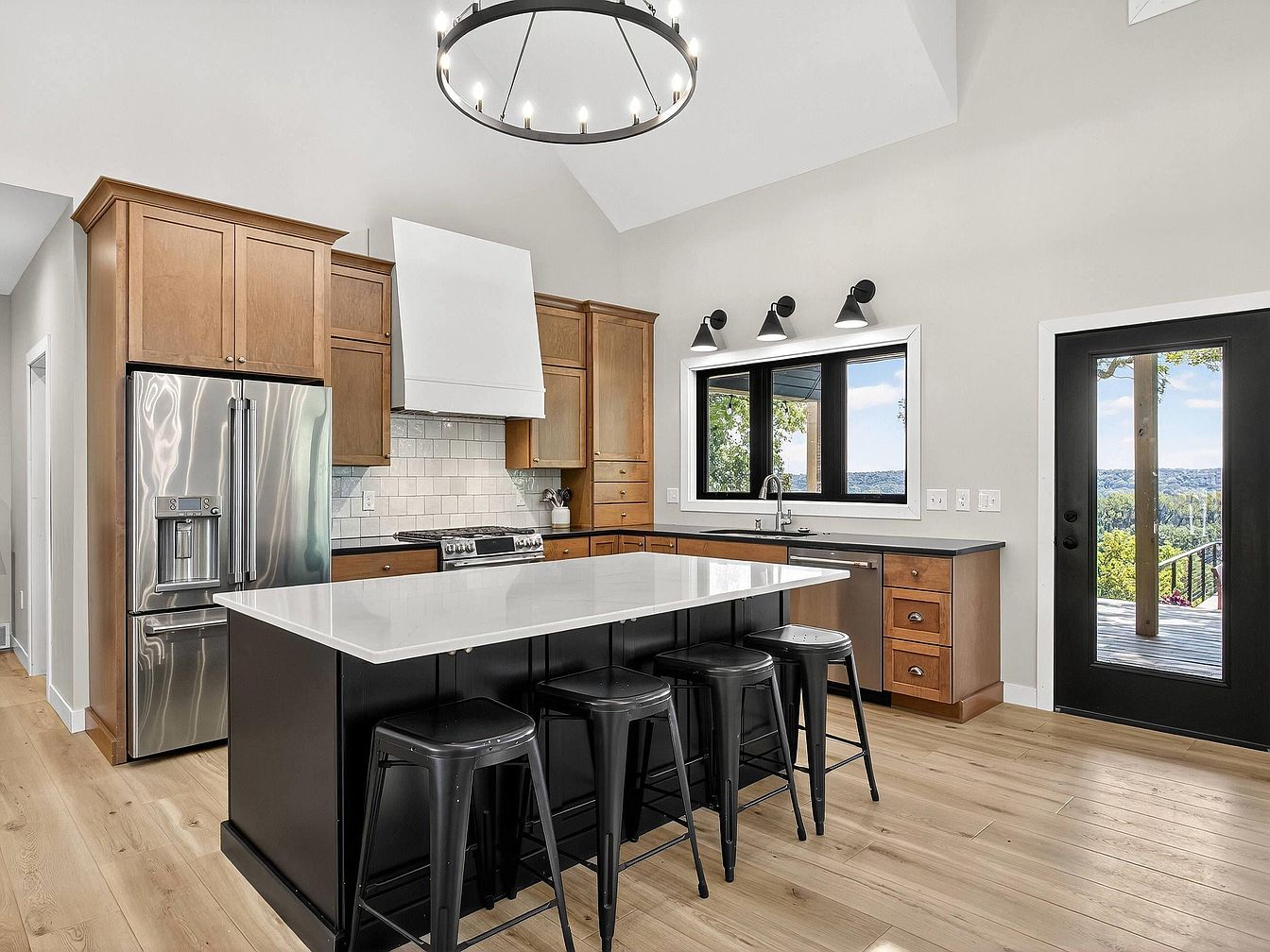 A modern kitchen with high ceilings and an open layout, featuring natural wood cabinetry and a large black island with a white stone countertop at the center. Four black metal stools are tucked under the island, creating a casual seating area. Stainless steel appliances, including a French door refrigerator and a gas range, line the back wall, which is accented with white subway tile. Above the sink, a wide window frames a scenic landscape view, flanked by two matte black sconces. Warm, light wood floors and neutral gray walls keep the space bright and inviting. A black-framed glass door leads to an outdoor deck.