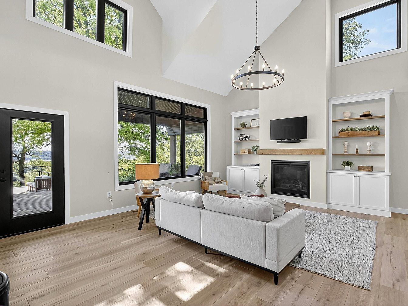 Spacious living room with a vaulted ceiling seen from above, featuring a large black-framed window and sliding door allowing generous natural light. Walls are painted soft gray and the floors are light wood, creating an airy feel. A plush cream-colored sectional sofa sits atop a textured neutral rug, centered around a wooden coffee table with a decorative vase. A cozy armchair and small round table with a lamp add additional seating near the window. Built-in shelving with wood accents surrounds a modern fireplace, topped by a mounted flat-screen TV. Black chandelier with exposed bulbs highlights the room’s modern farmhouse style.
