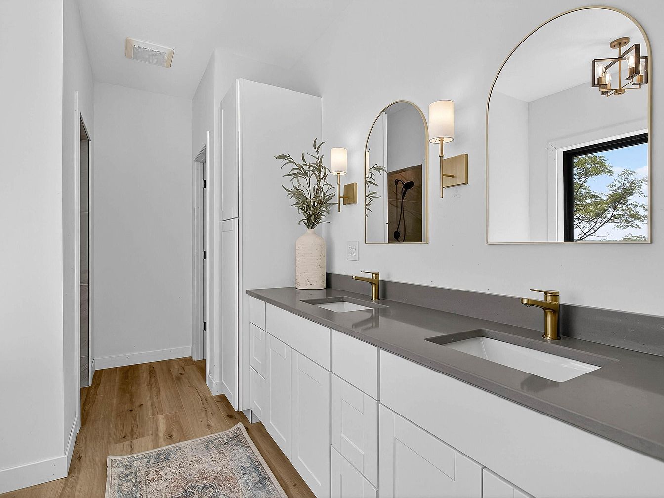 Long double-sink vanity with flat-front white cabinetry and sleek gray countertop. Two gold-framed arched mirrors are paired with contemporary wall sconces featuring white shades. Brushed brass faucets add a touch of elegance above each rectangular undermount sink. A large window on the right fills the space with natural light, illuminating the airy white walls. The flooring is natural toned wood, providing warmth and contrast to the monochromatic palette. An understated ceramic vase with greenery sits between the sinks, while a muted patterned runner rug adds subtle texture to the entryway. The overall look is minimalist, bright, and elegant.