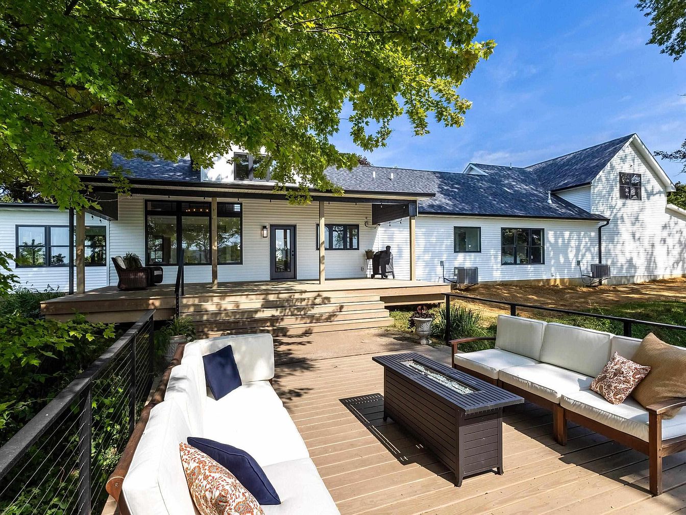 A spacious wooden deck sits at the rear of a historic American home, surrounded by large leafy trees that provide shade and a tranquil ambiance. Comfortable outdoor seating with white cushions and accent pillows is arranged around a sleek, rectangular fire pit table, creating an inviting space for gatherings. The home’s exterior features clean white siding with black trim, large windows, and several doors opening onto the deck. Architectural details include a wide overhanging roof and subtle modern touches alongside traditional farmhouse elements. The setting blends natural greenery and sophisticated outdoor living for a warm, welcoming effect.